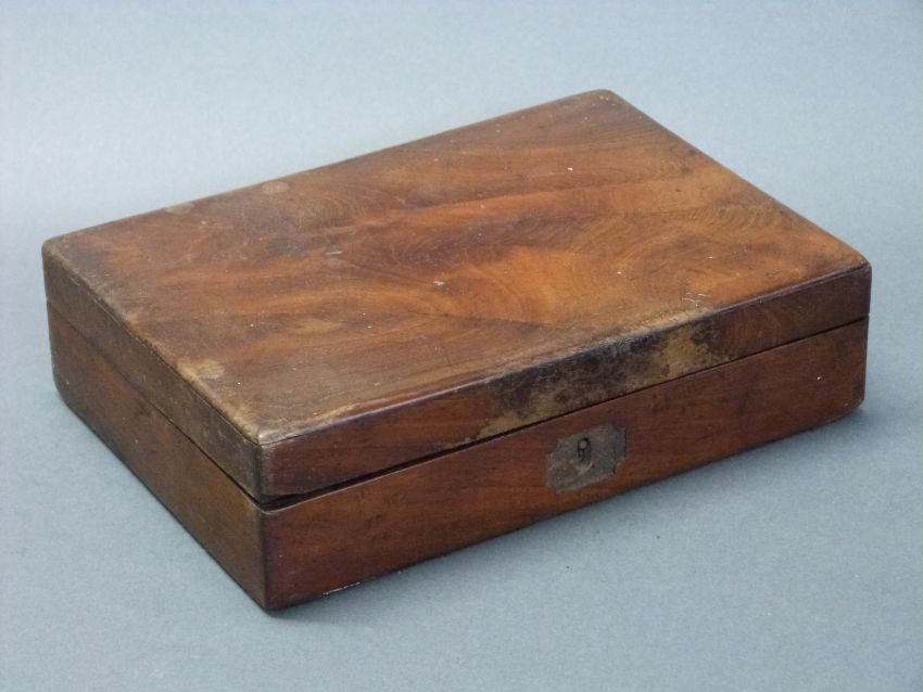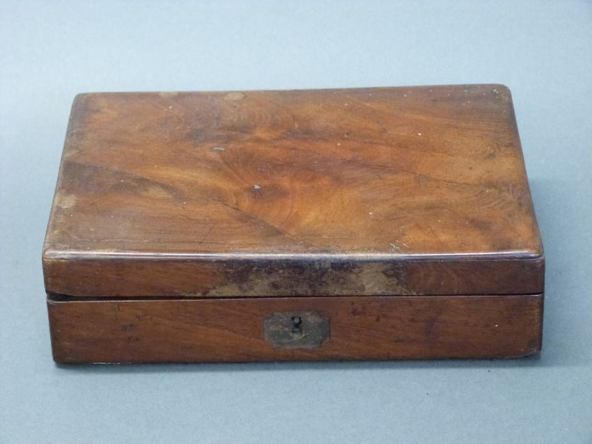 A mahogany pistol box with velvet-lined fitted interior to accommodate a pair of percussion pistols and accessories, 21cm x 15cm