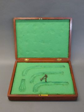 A mahogany pistol box with felt-lined fitted interior to accommodate three percussion pistols and a powder flask, with original key, 35cm x37cm