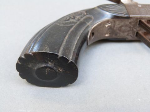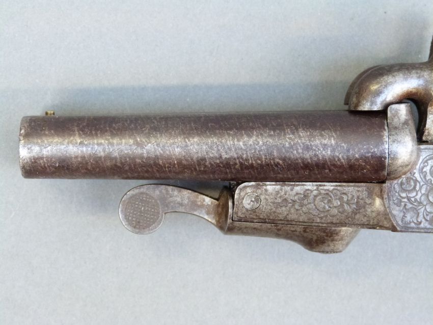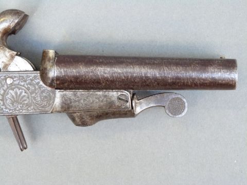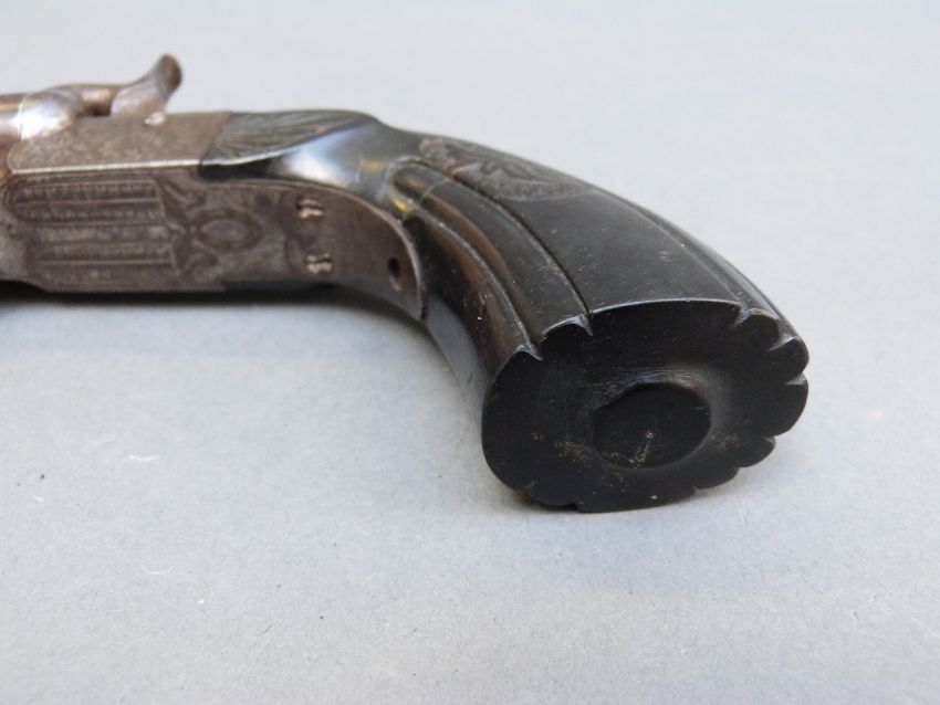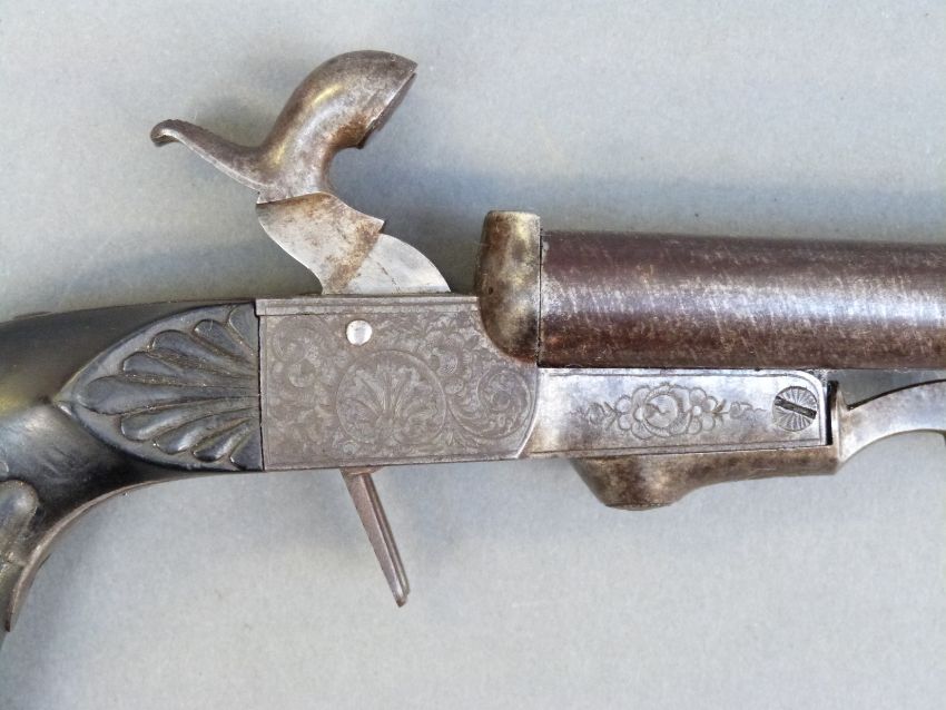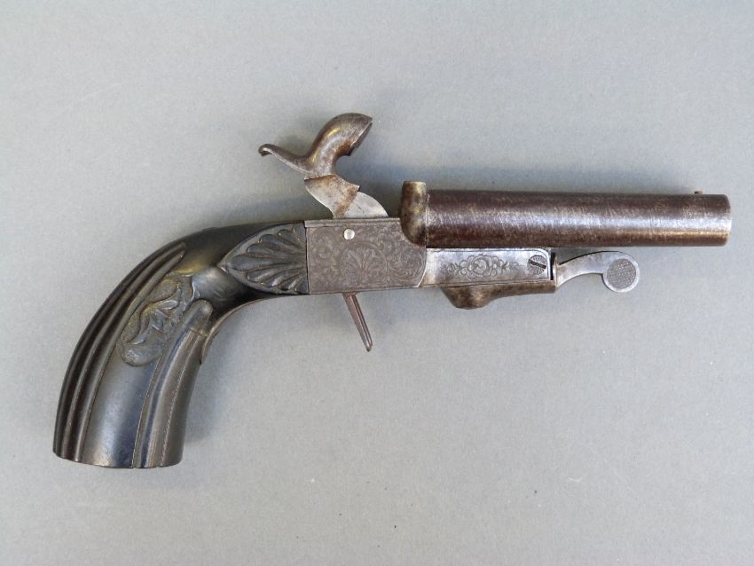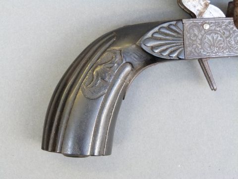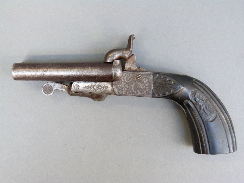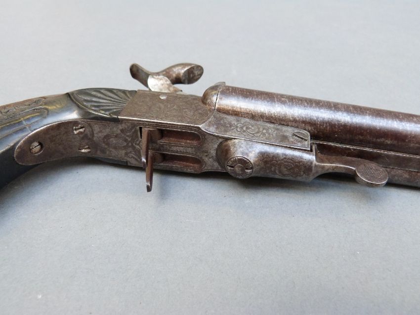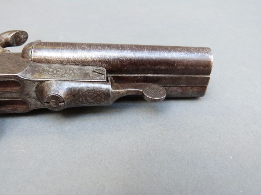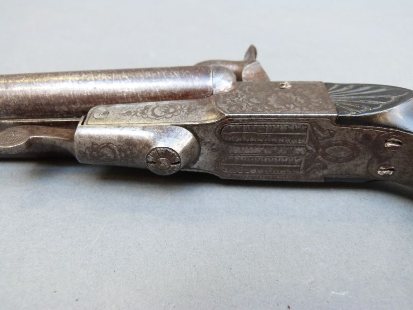 Percussion hammer action side by side pistol with engraved locks and top plate, carved and reeded grip, folding triggers and 3.5 inch Damascus rifled barrels, overall length 21cm