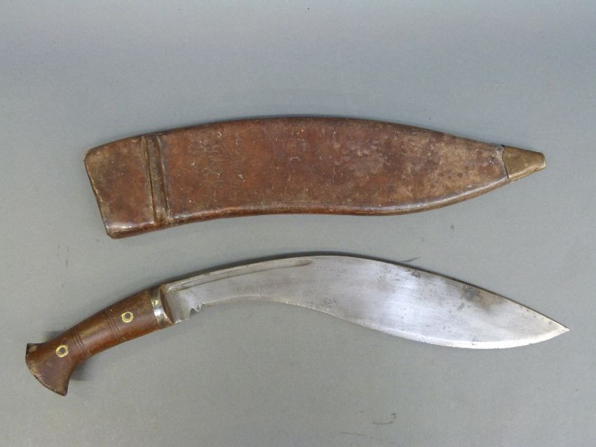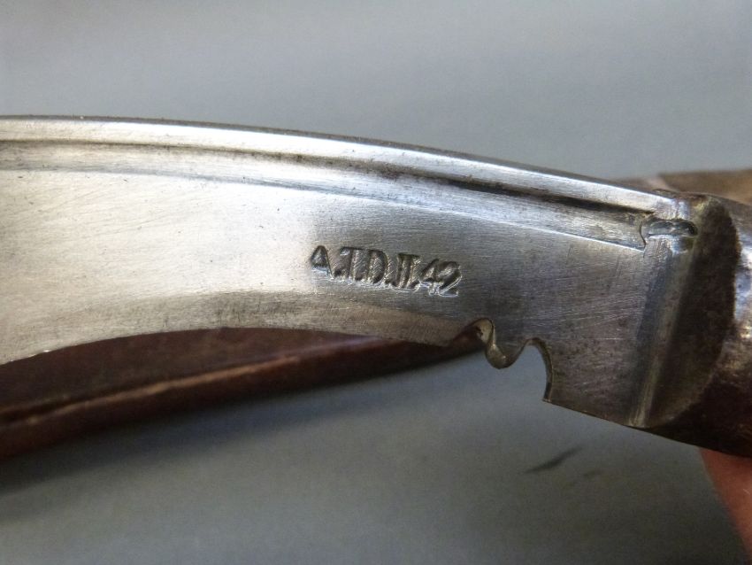 A WWII Gurkha kukri in sheath, marked to blade A.T.D 1142