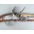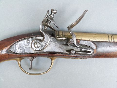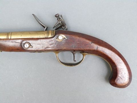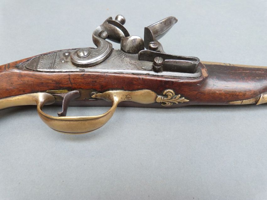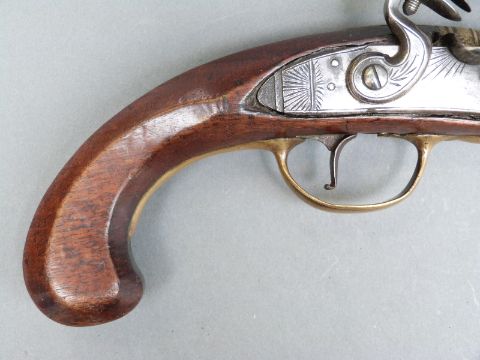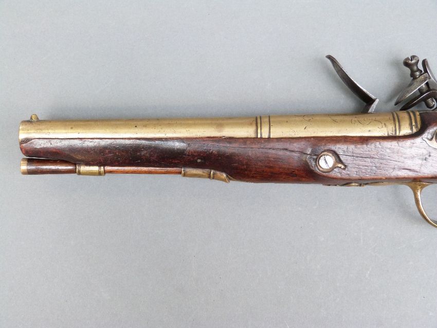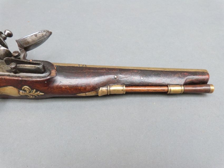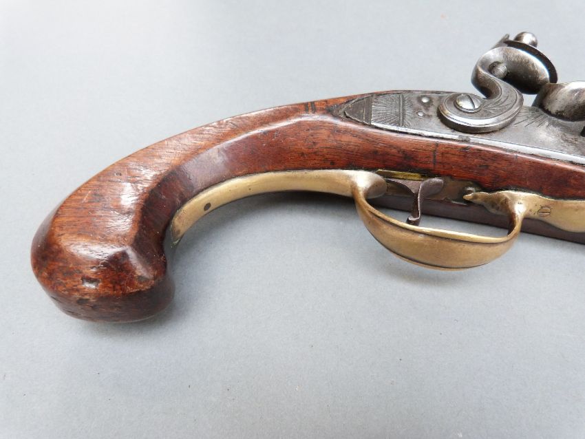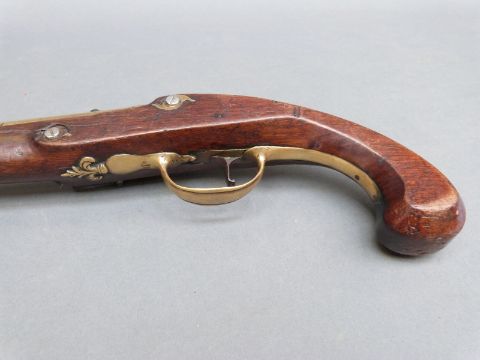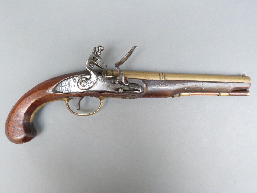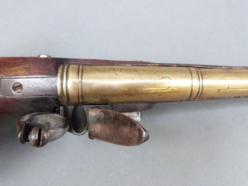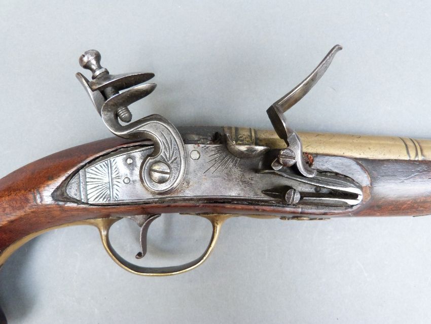 22 bore flintlock hammer action pistol with engraved lock and hammer, brass fleur de lis finialled trigger guard, walnut stock, brass tipped wooden ram-rod and engraved 9 inch brass two stage smooth bored barrel, overall length 39cm