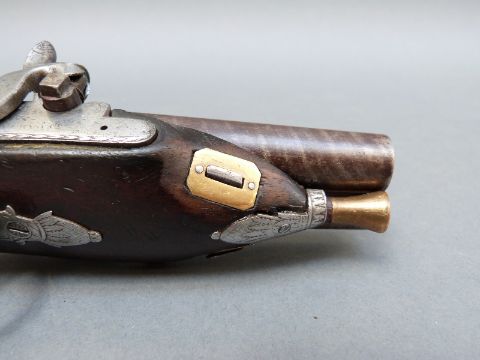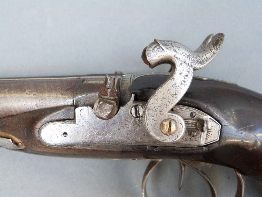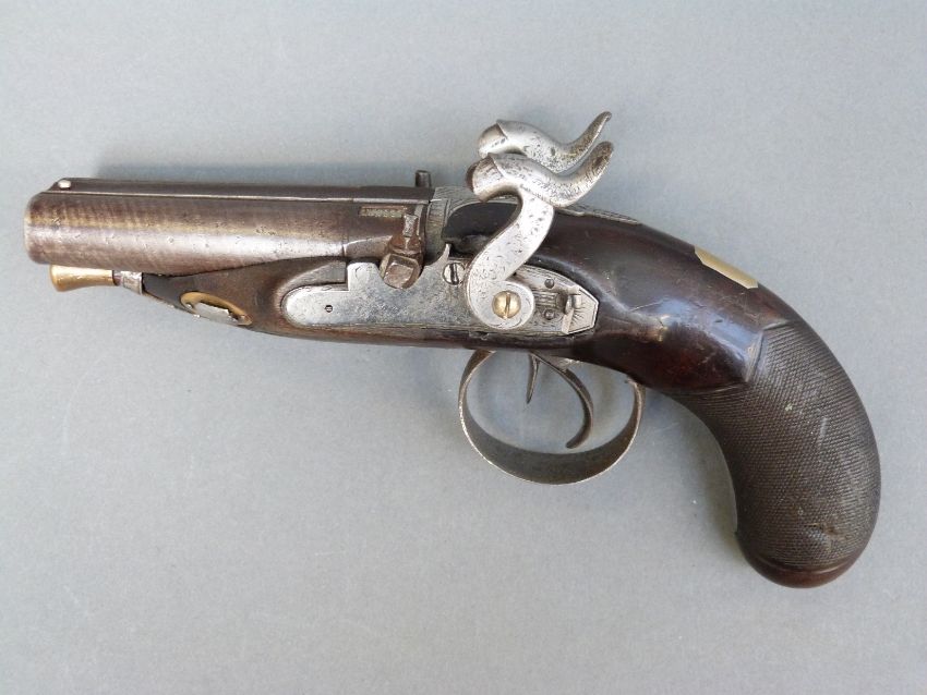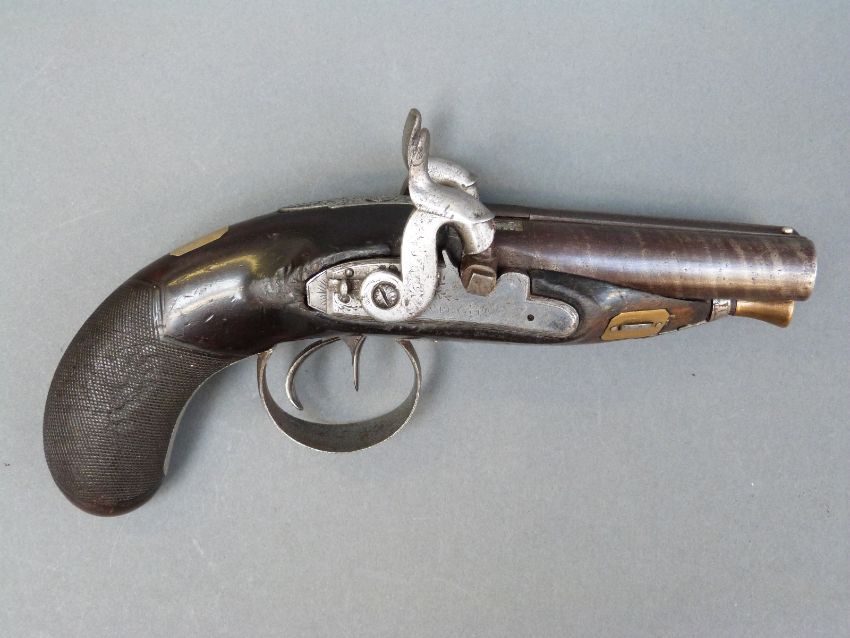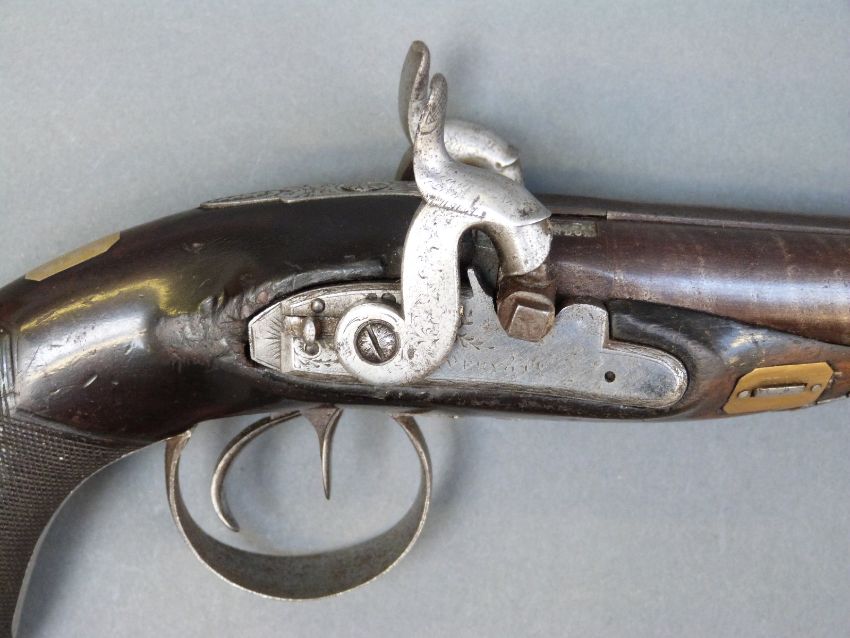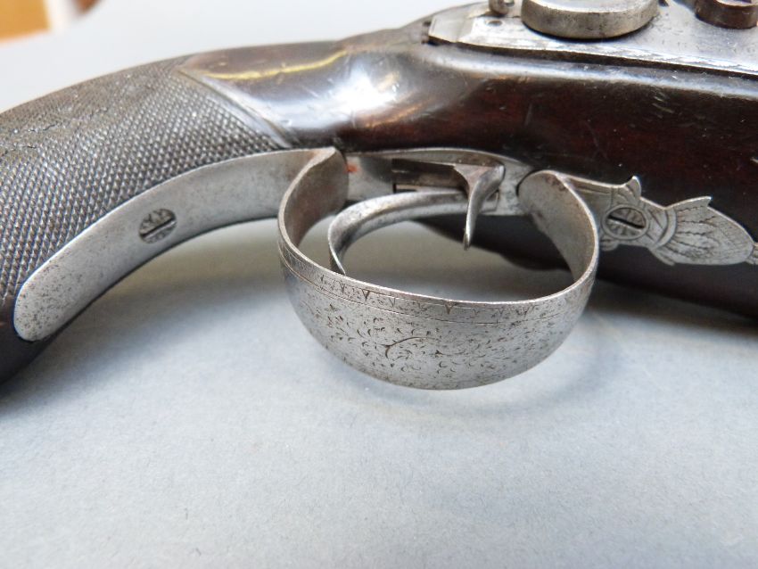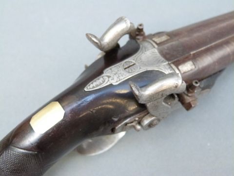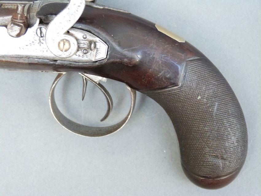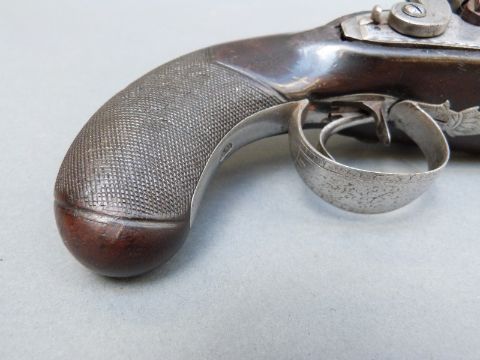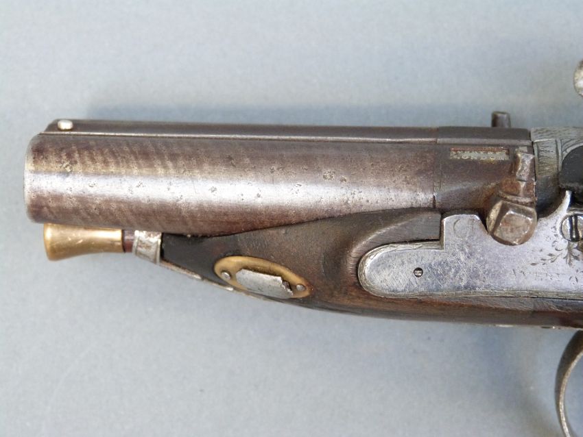 Avery & Co of London double barrelled side by side percussion hammer action pistol with name and engraved locks, engraved top plate, engraved and pineapple finialled trigger guard, thumb slide safeties, chequered grip, vacant wrist cartouche, brass tipped ramrod, engraved ramrod mount and 3.5 inch named and inlaid and engraved smooth bored Damascus barrels, overall length 21cm.