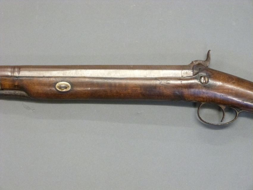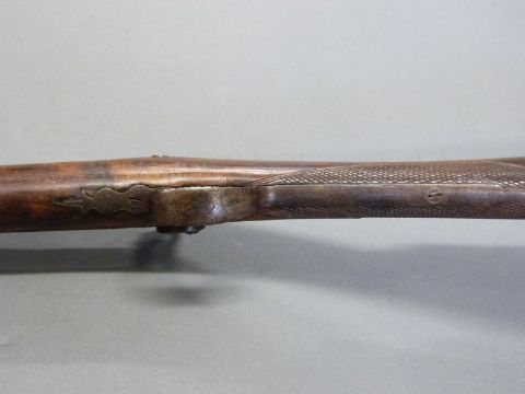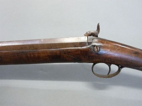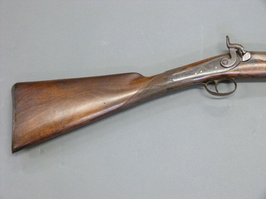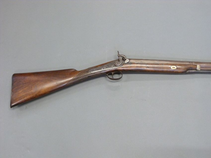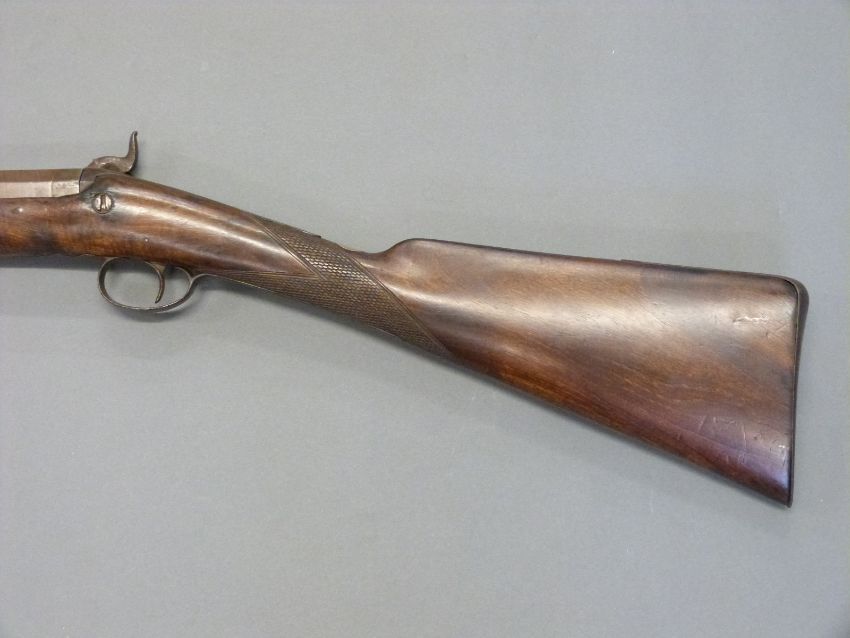 Durs Egg of London 12 bore single barrelled percussion hammer action gun with named and engraved locks, engraved hammer and top plate, engraved and pineapple finialled trigger guard, steel butt plate and mounts, chequered grip, vacant wrist cartouche and 31.5 inch multi stage part octagonal Damascus barrel named 'D.Egg, London', overall length 120cm.