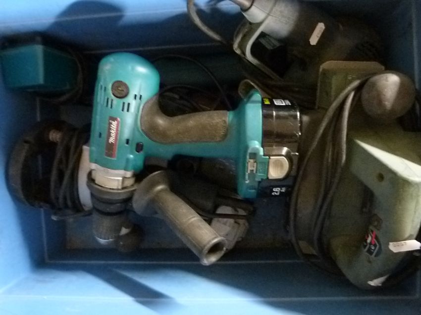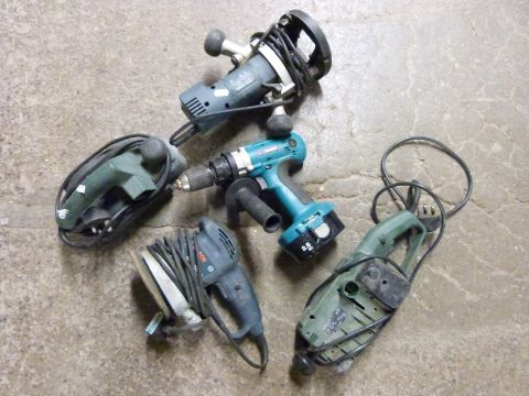 A quantity of Black and Decker, Bosch and Makita power tools including router, cordless drill etc