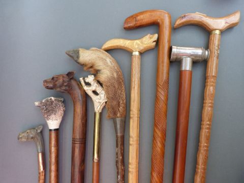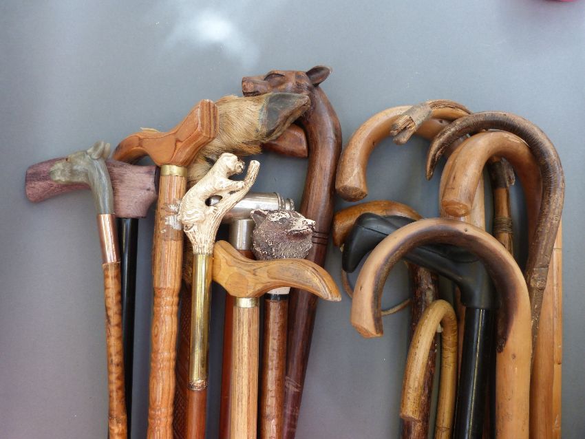 Approximately 20 various walking sticks including carved dog example, telescope etc