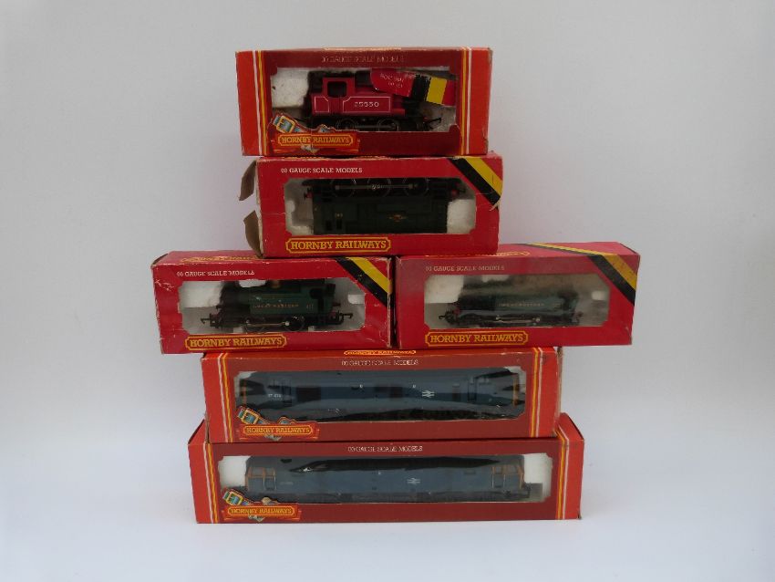 Six Hornby 00 gauge locomotives including BR Class 37 Diesel R369, BR Class 47 Diesel R404, GWR 0-4-0 tank R077 etc., all in original boxes
