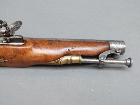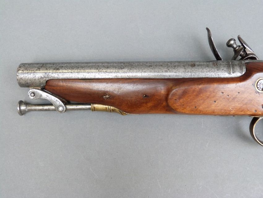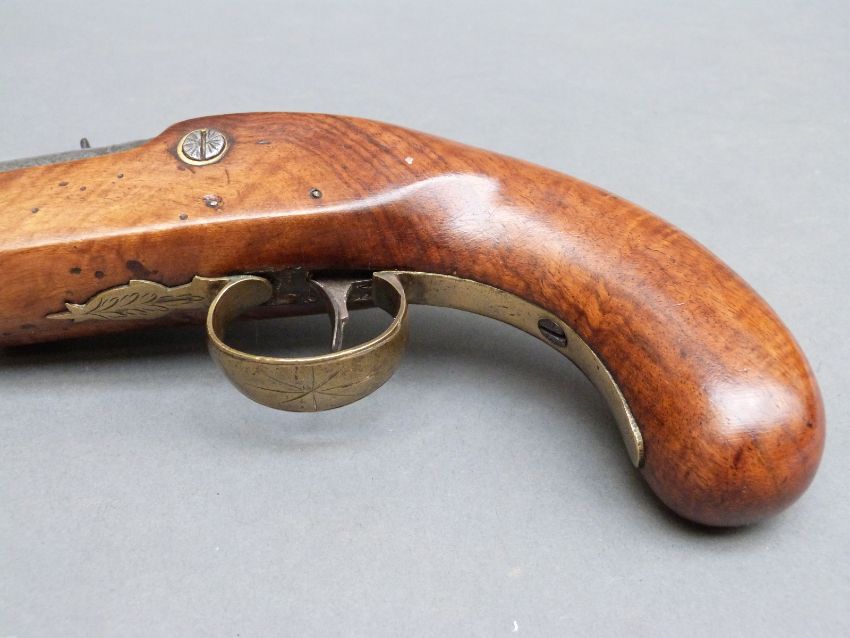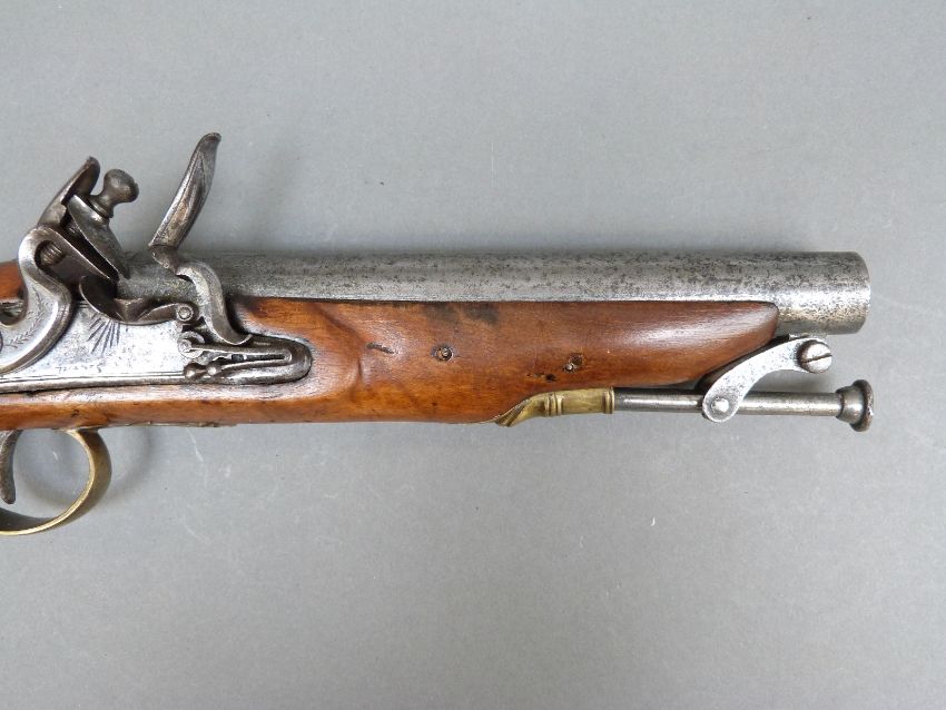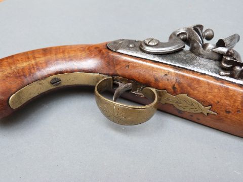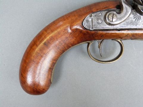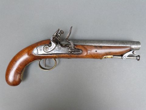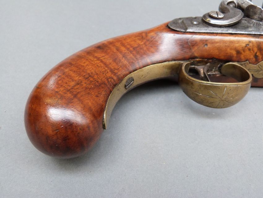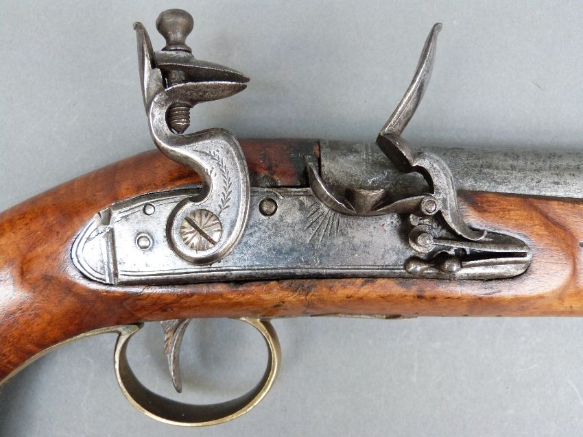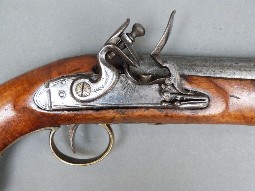Davis of London private purchase New Land Pattern flintlock hammer action pistol with engraved lock, hammer and trigger guard, brass mounts captive ramrod and eight inch barrel named 'London', overall length 36cm.