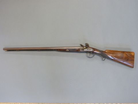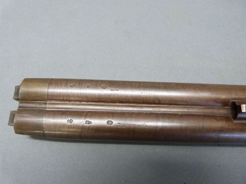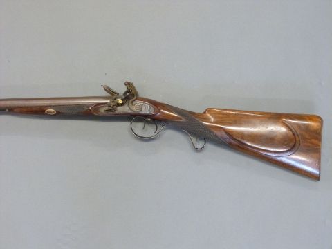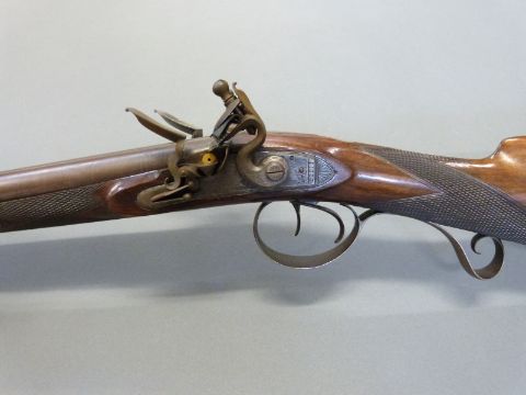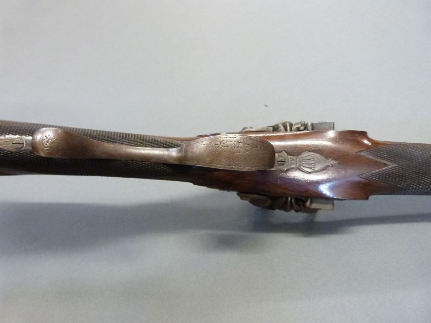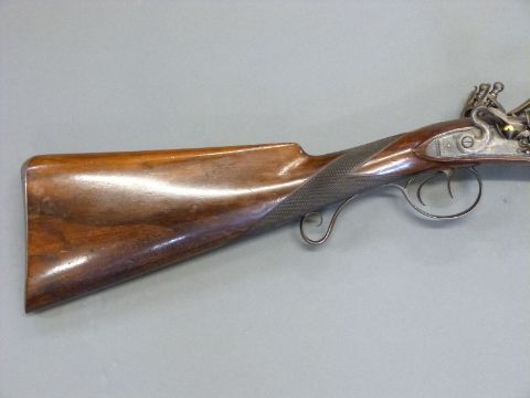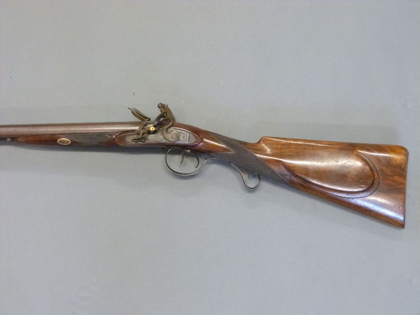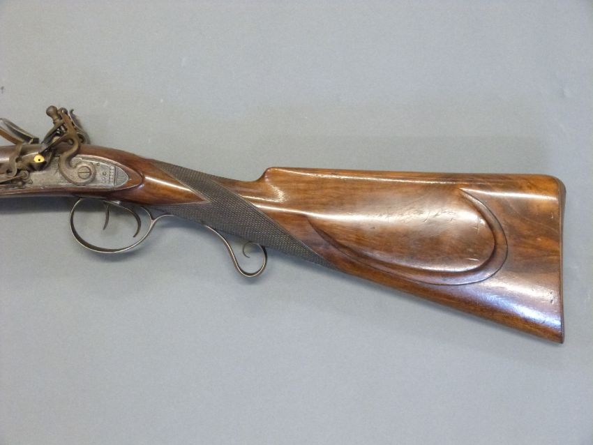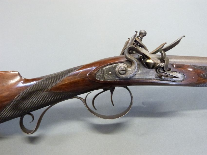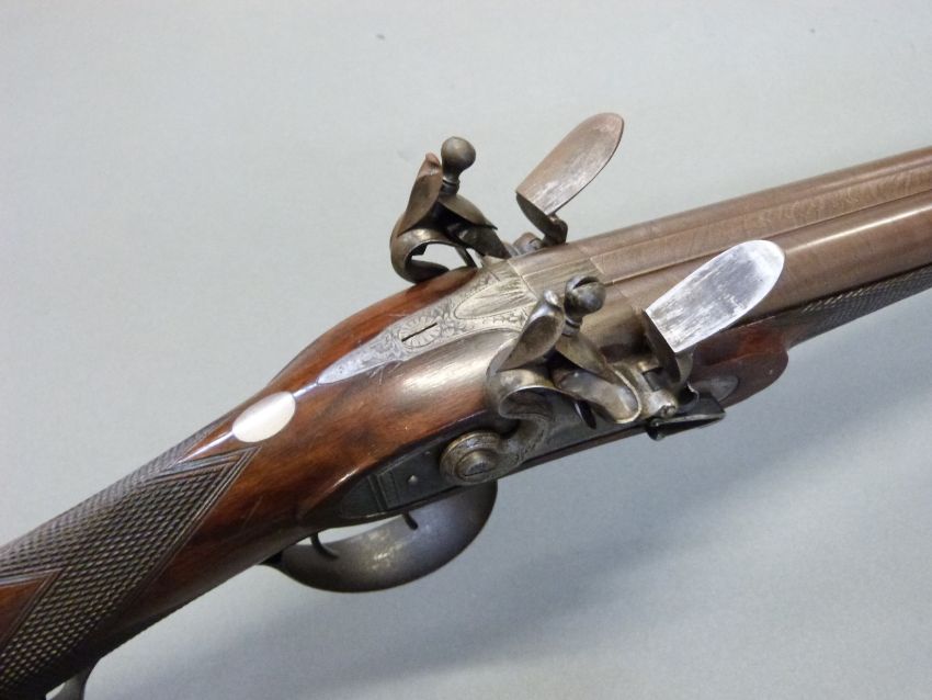 W Allport of London 18 bore side by side flintlock hammer action gun with named and engraved locks, engraved hammers, top plate and butt plate, chequered grip and forend, double trigger, engraved and pineapple finialled scrolling trigger guard, shaped walnut stock, vacant wrist cartouche and 28 inch Damascus barrels engraved 'London', overall length 112cm.