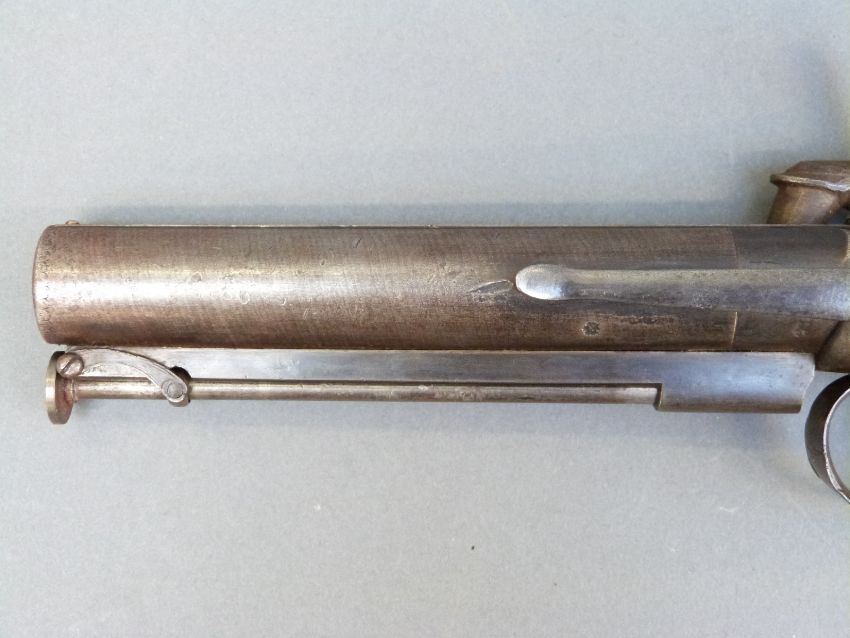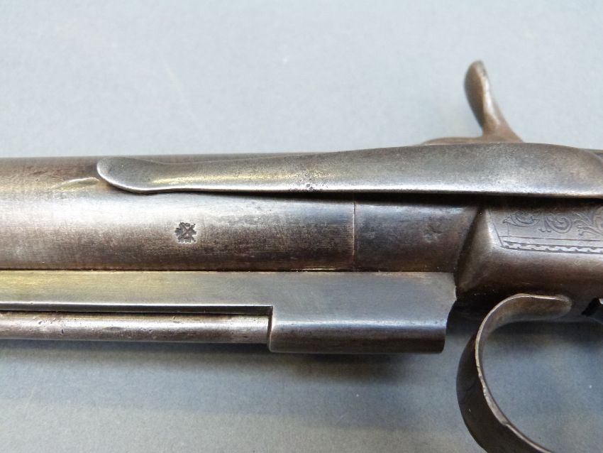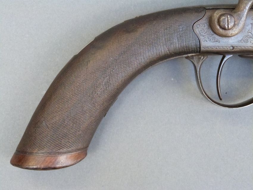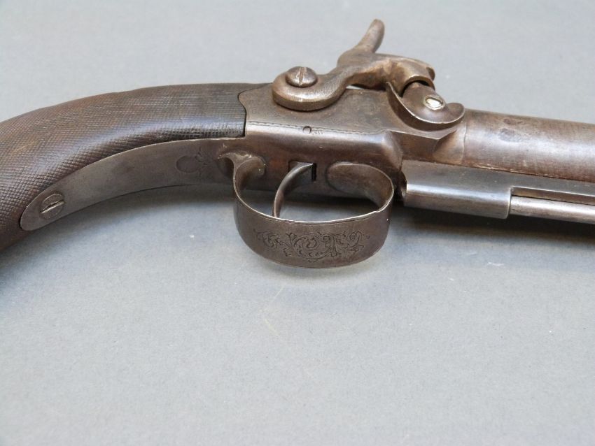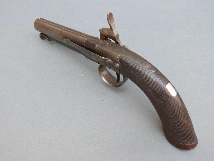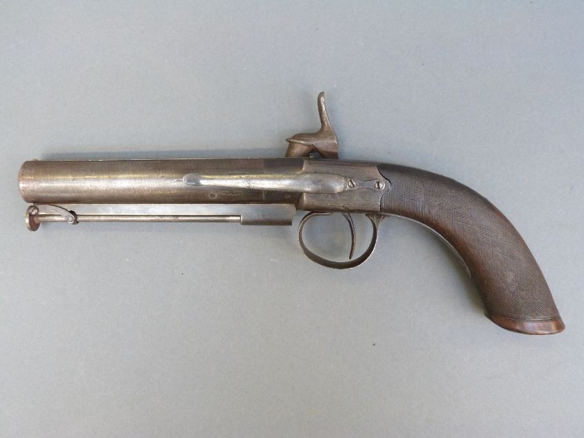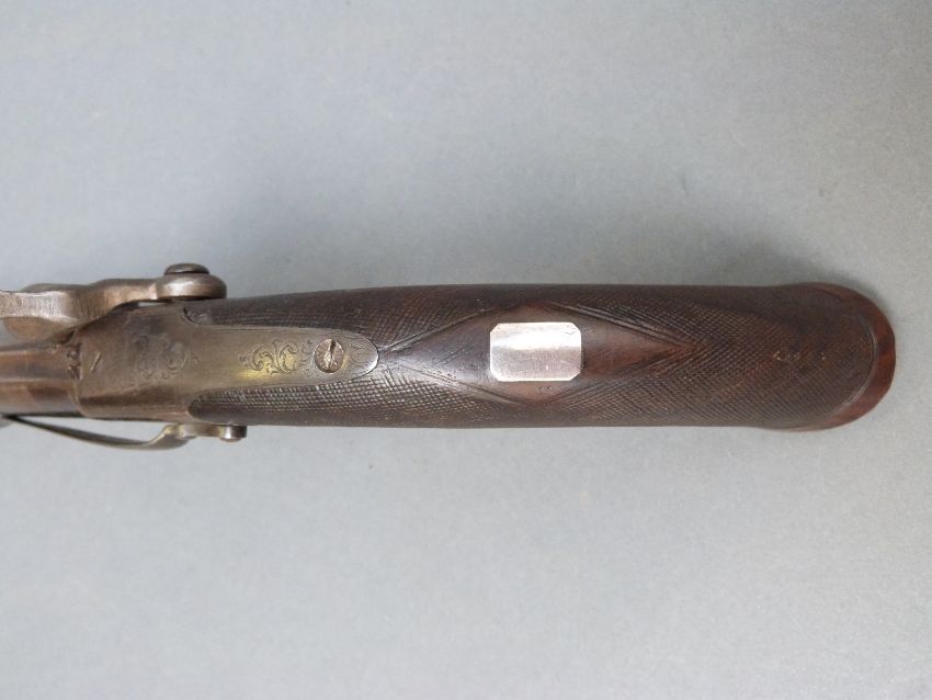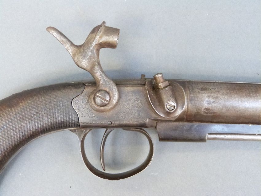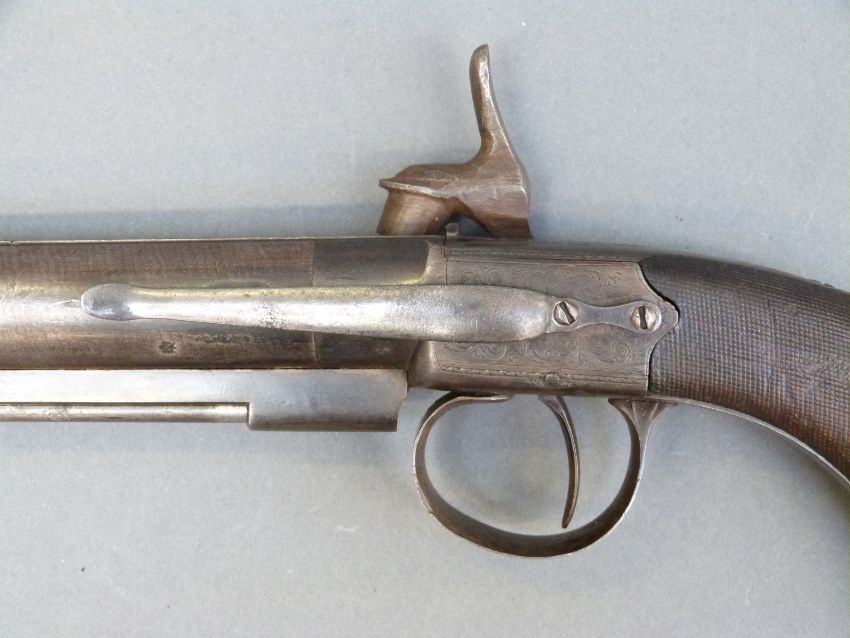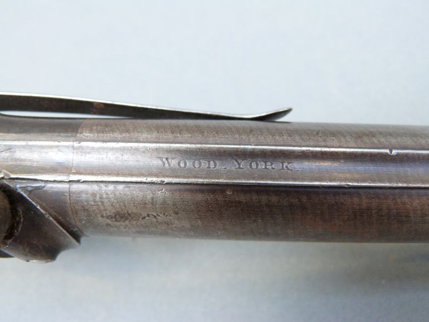 Wood of York, 16 bore percussion hammer action belt pistol with engraved lock, top plate and trigger guard, captive ramrod, chequered grip, vacant wrist cartouche, shell carved butt, belt hook engraved 'Wood.York.' and 5.5 inch smooth bored barrel, overall length 30cm.