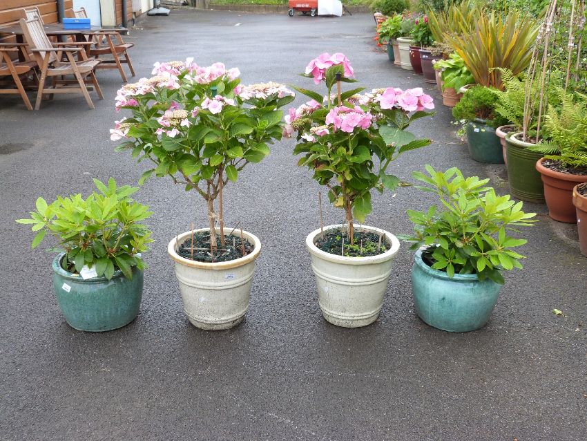 Two standard pink hydrangeas and a pair of rhodedendron "Percy Wiseman", all in outdoor pots