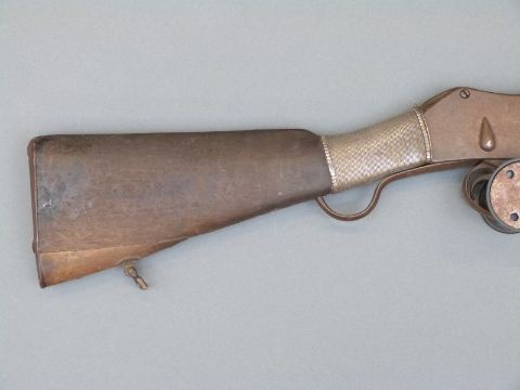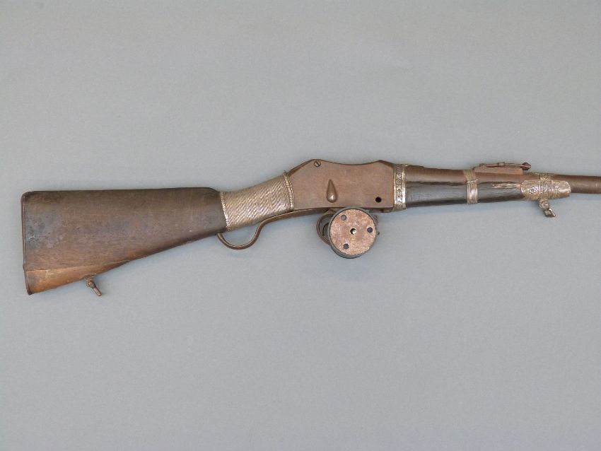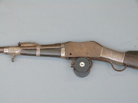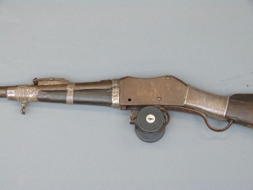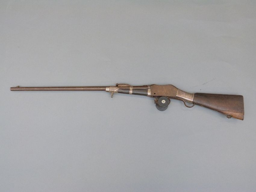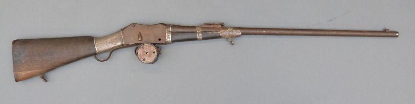 Martini Henry underlever action rifle with ornate silver banding, indistinct stamp to lock, sling suspension loops and 26 inch barrel, overall length 119cm.