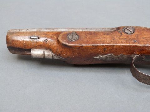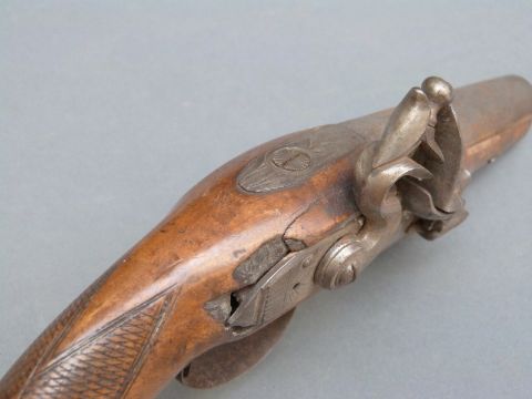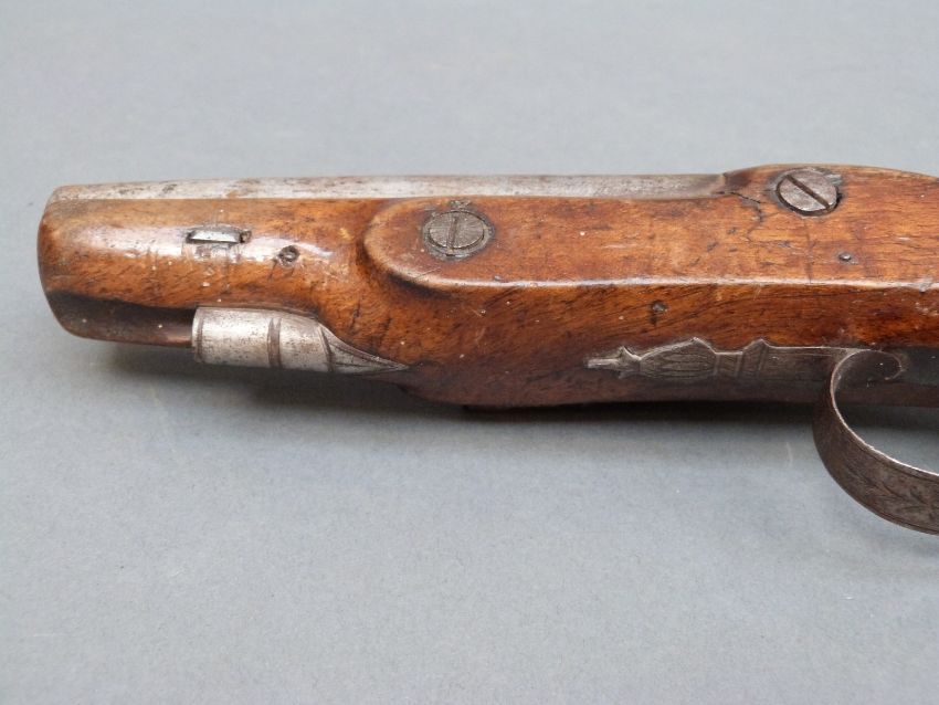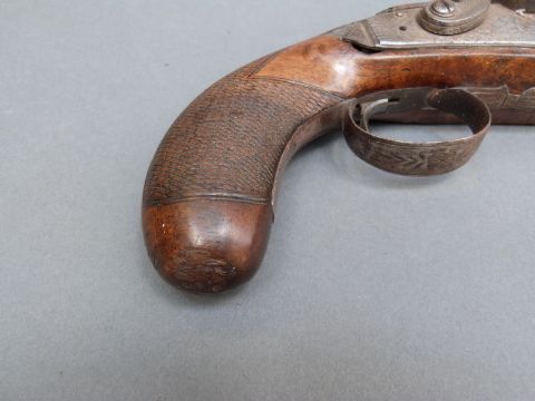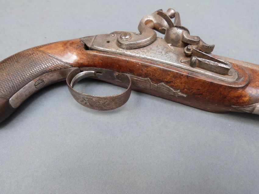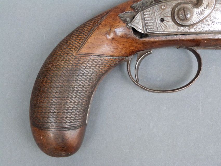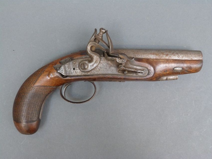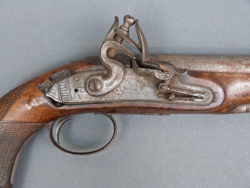 Burnett of Southampton 20 bore flintlock hammer action pistol with named and engraved lock, engraved hammer and top plate, engraved and pineapple finialled trigger guard, chequered grip and five inch smooth bored barrel, overall length 27cm.