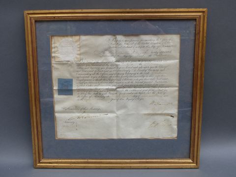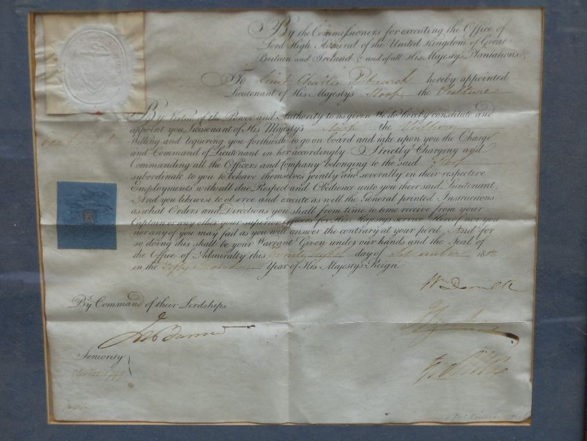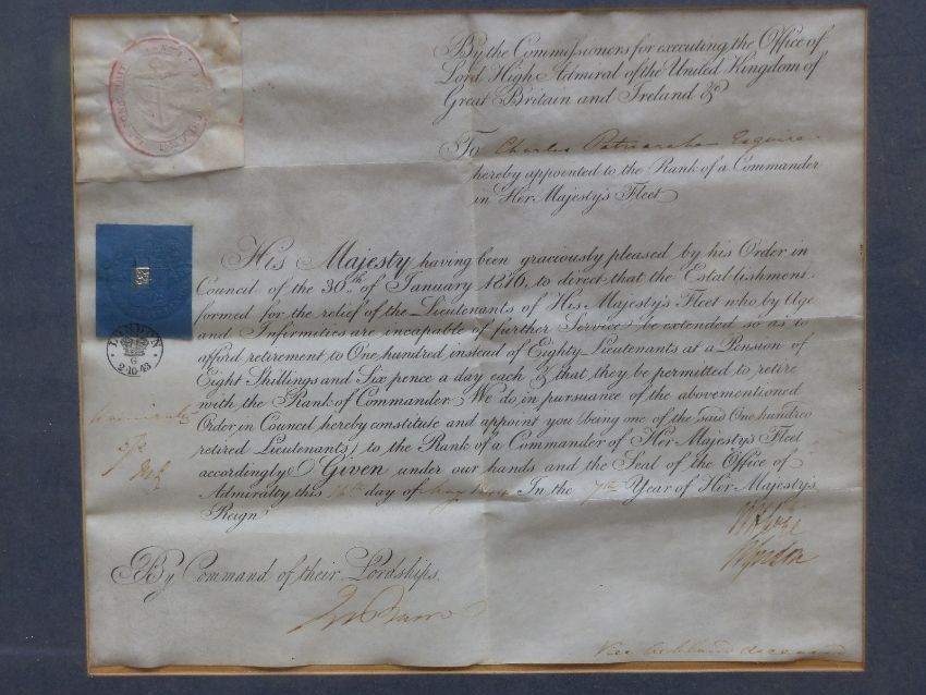 Two late 18th/mid 19th century Royal Navy Commissions on parchment to Charles Patriarch, one for his appointment to Lieutenant on HMS sloop 'Vulture' the other to the rank of Commander on his retirement. Commander Patriarch fought in the Battle of St Domingue in 1806 on board HMS 'Superb' where he received a serious leg wound. He afterwards received a gratuity of £91.55 plus an annual pension of £91.55 until his death on the 16th January 1850. At one time he lived in Worcester Street, Gloucester.