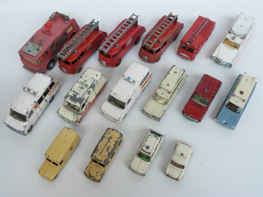 Sixteen Dinky Toys diecast model emergency vehicles including police, ambulance and fire brigade