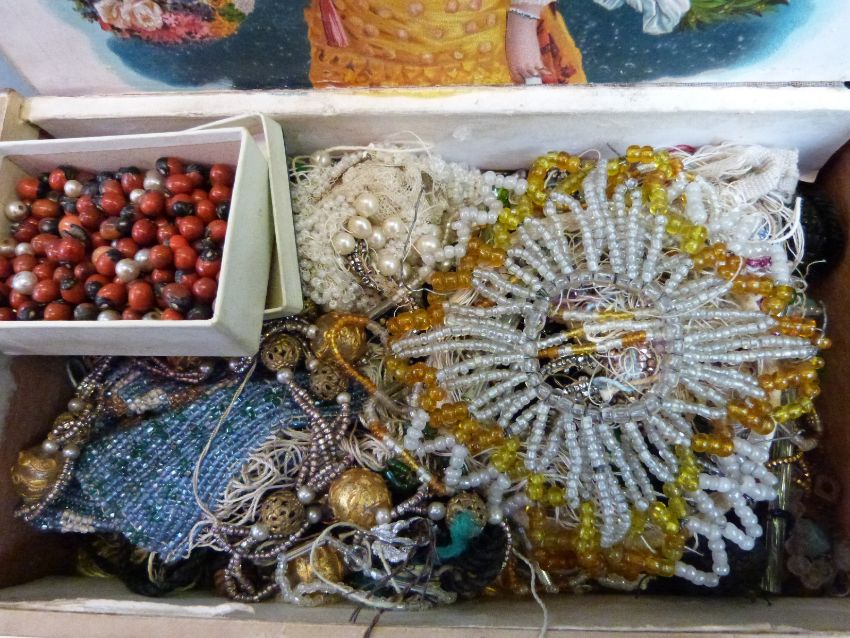 A quantity of beads and associated items, wicker style basket and a travelling box