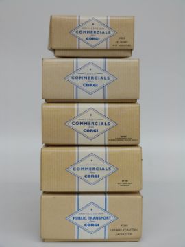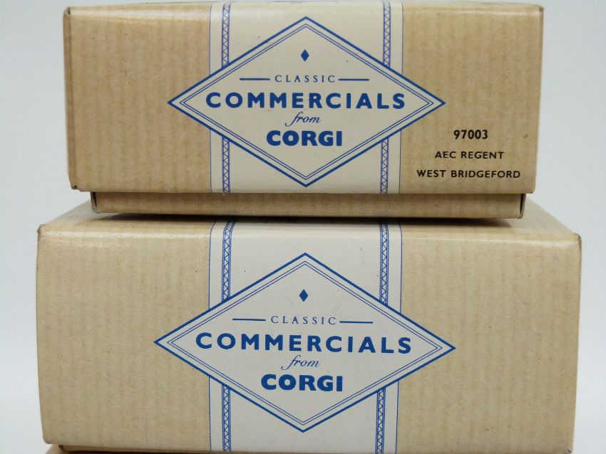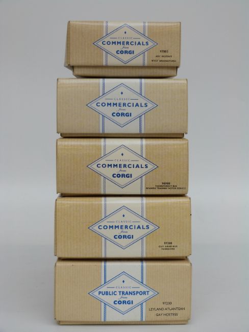 Five Corgi Classic Commericals and Public Transport diecast model double decker buses Guy Arab 97208, AEC Regent 97003, Leyland Atlantean 97230, Thornycroft 96988 and 96986, all in original boxes