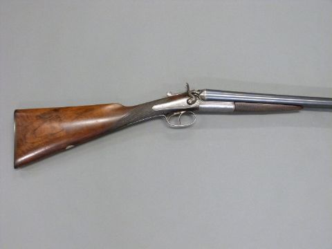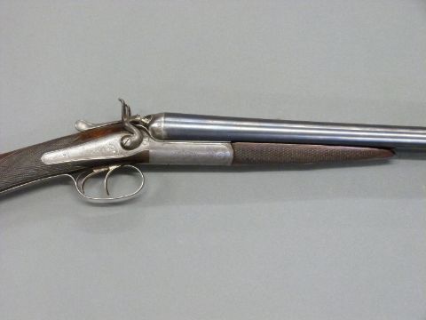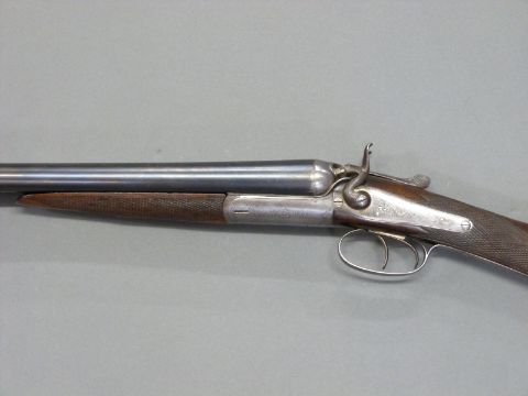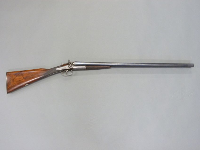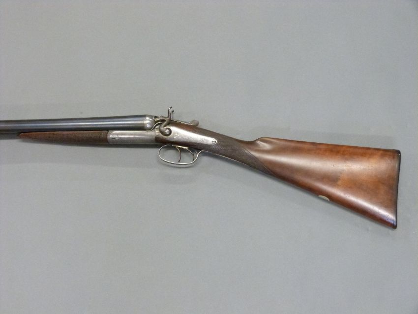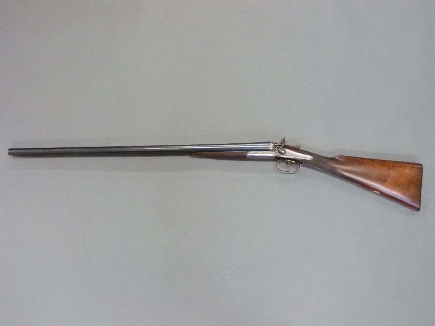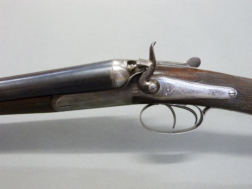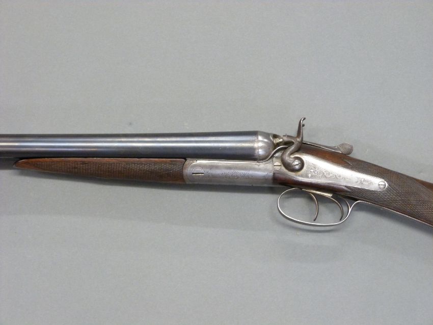Army & Navy CSL 12 bore side by side hammer action shotgun with named and engraved locks, engraved rebounding hammers, top plate and top lever, chequered grip, double trigger, vacant cartouche to stock and 28 inch barrels engraved 'Army & Navy C.S.L London', overall length 112.5cm, in original fitted canvas and leather case. PLEASE NOTE THAT A VALID RELEVANT FIREARMS/SHOTGUN CERTIFICATE IS REQUIRED TO HANDLE/PURCHASE THIS ITEM.