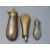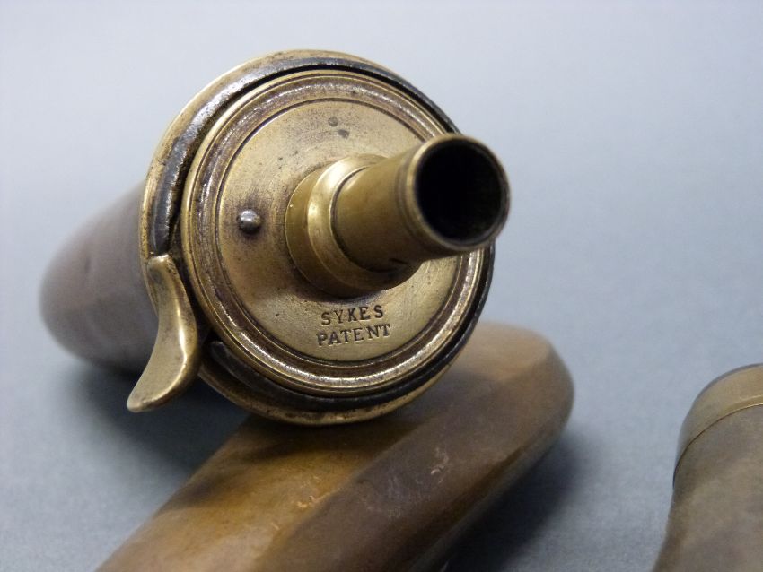 Three copper and brass pistol powder flasks the largest by Sykes 14.5cm long.