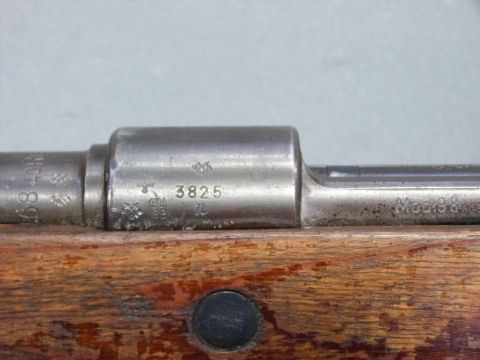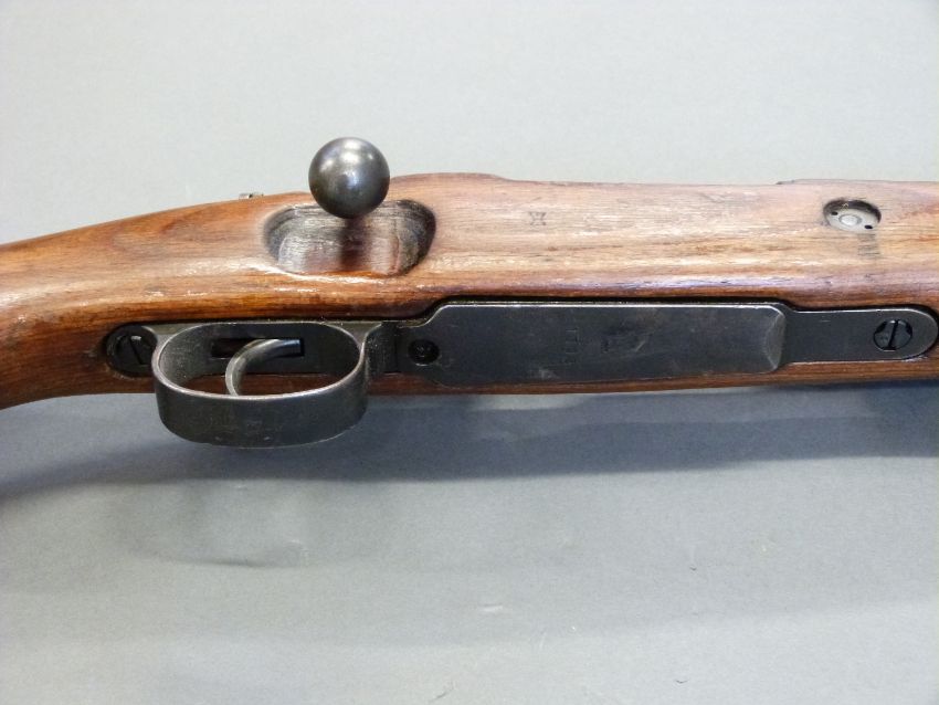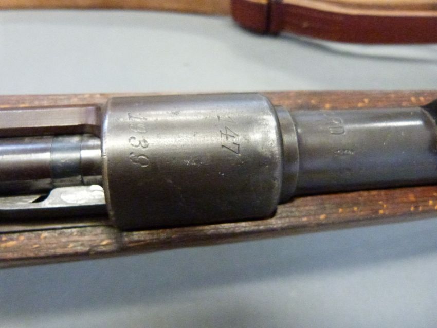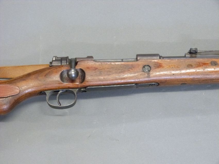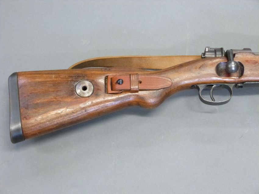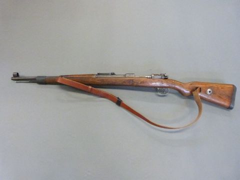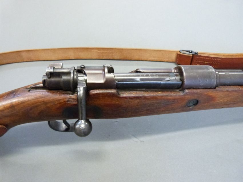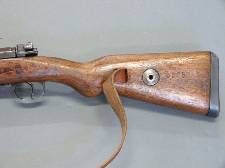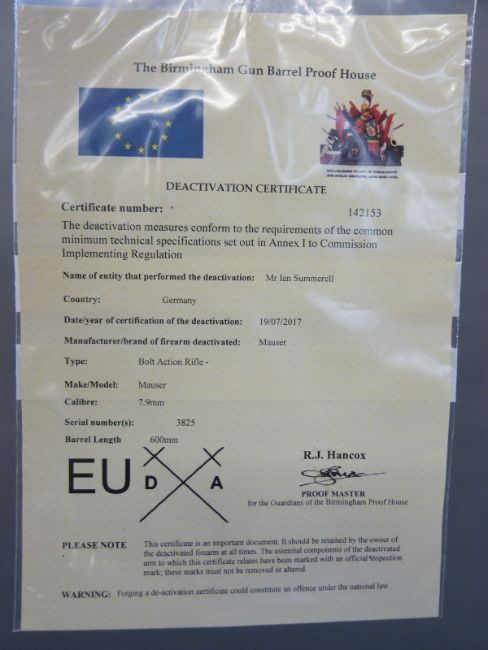 Deactivated Mauser K98 bolt action rifle with adjustable rear sight, leather sling, steel butt plate and mounts and 24 inch barrel, c1943, overall length 111cm, serial number 3825, with current deactivation certificates dated 19/07/17