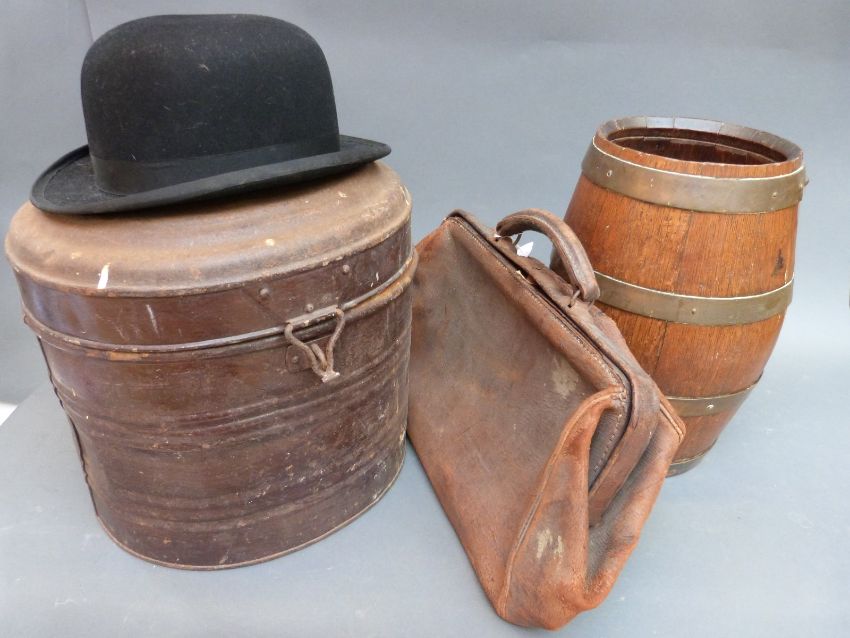 A coopered barrel, Gladstone style bag, metal hat box and a Dunn & Co bowler hat