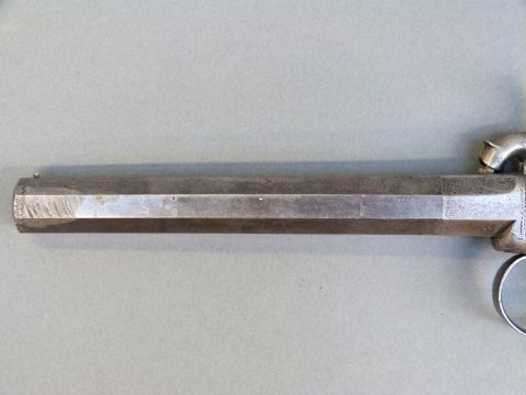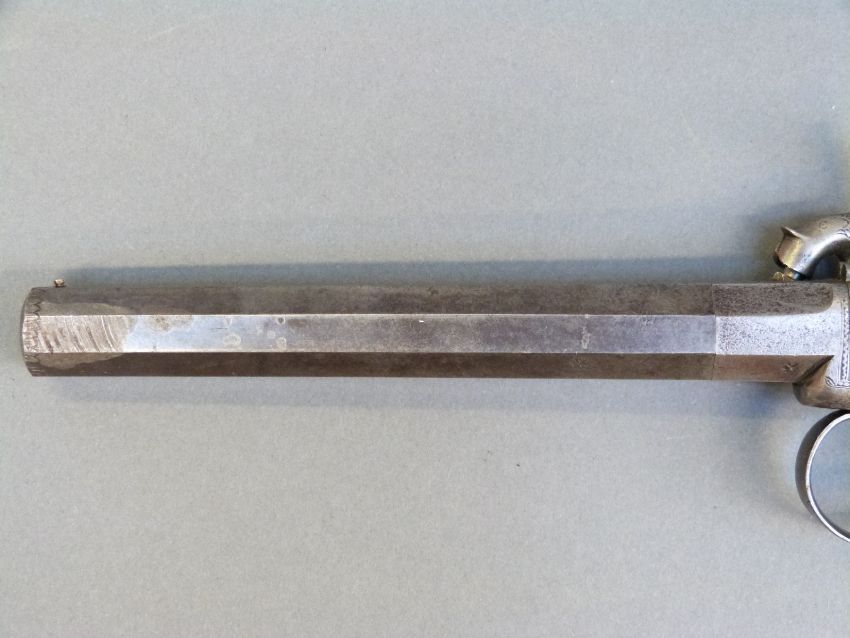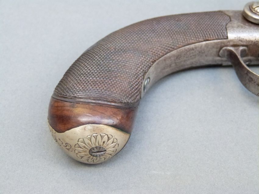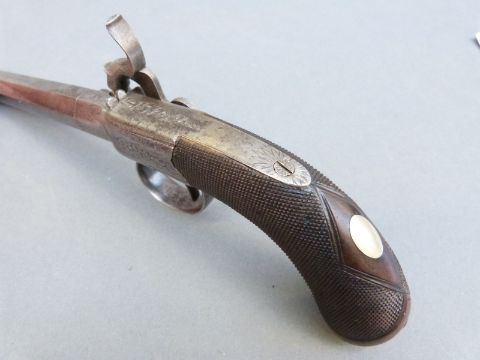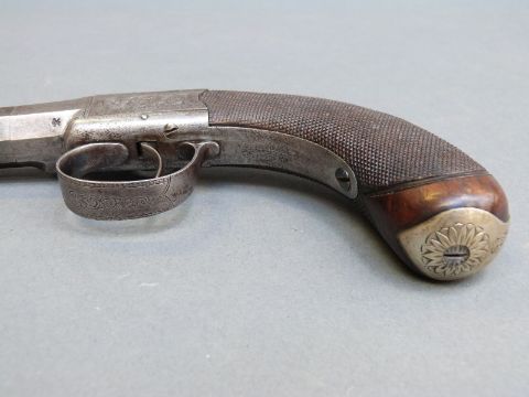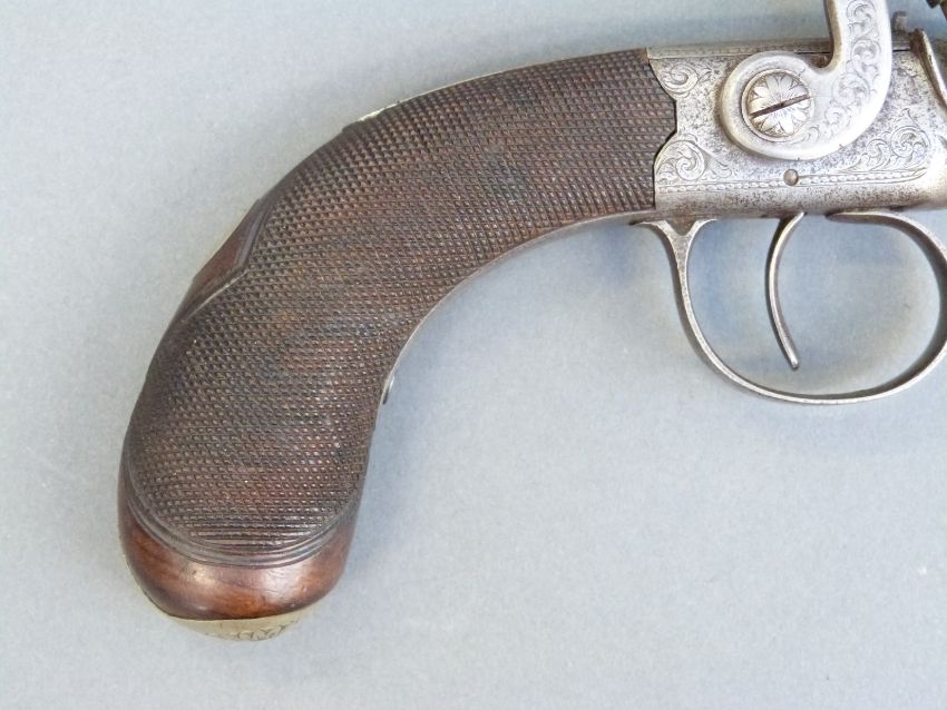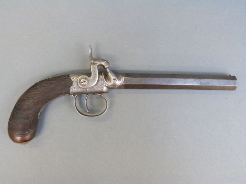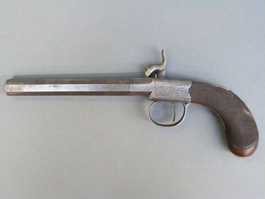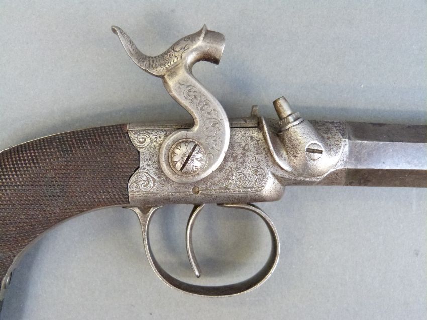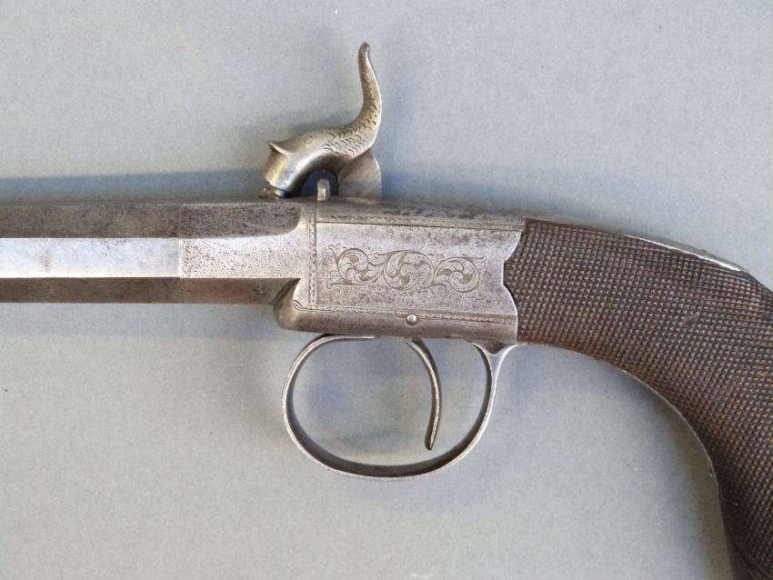 Thomas Fletcher of Gloucester 36 bore percussion hammer action pistol with engraved lock, trigger guard, butt cap, top plate and stylised dolphin hammer, chequered walnut grip, vacant wrist cartouche and named 5 inch turn off rifled octagonal barrel engraved at the muzzle, overall length 27cm.