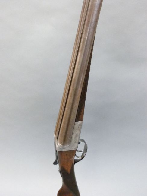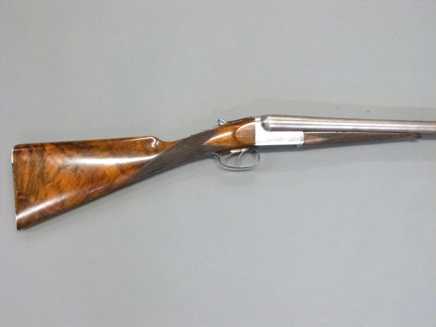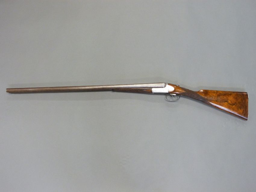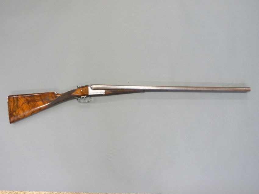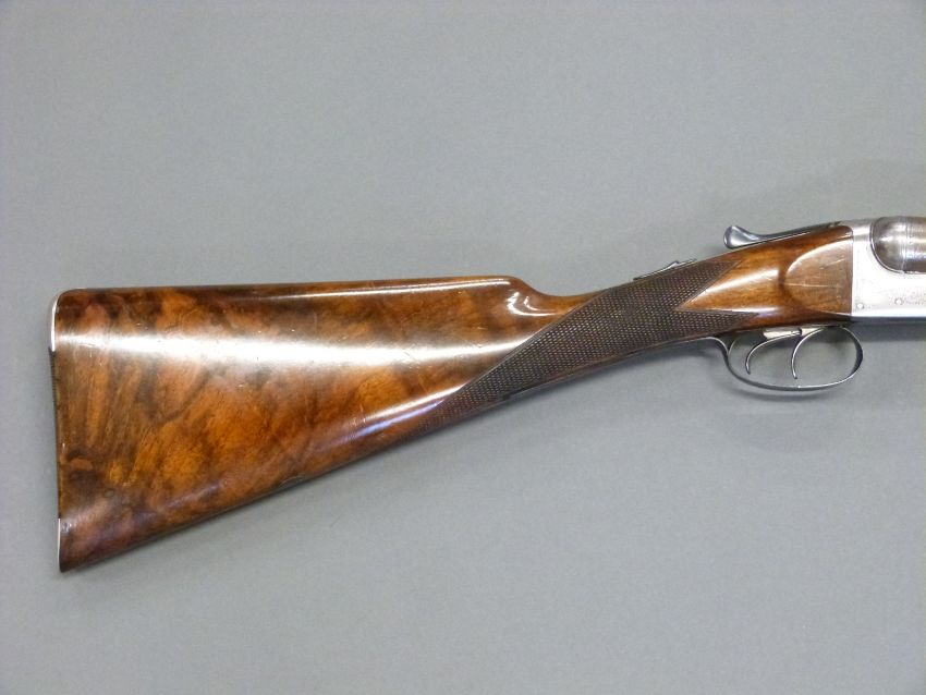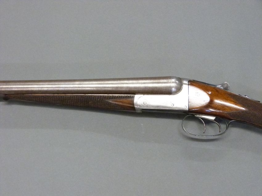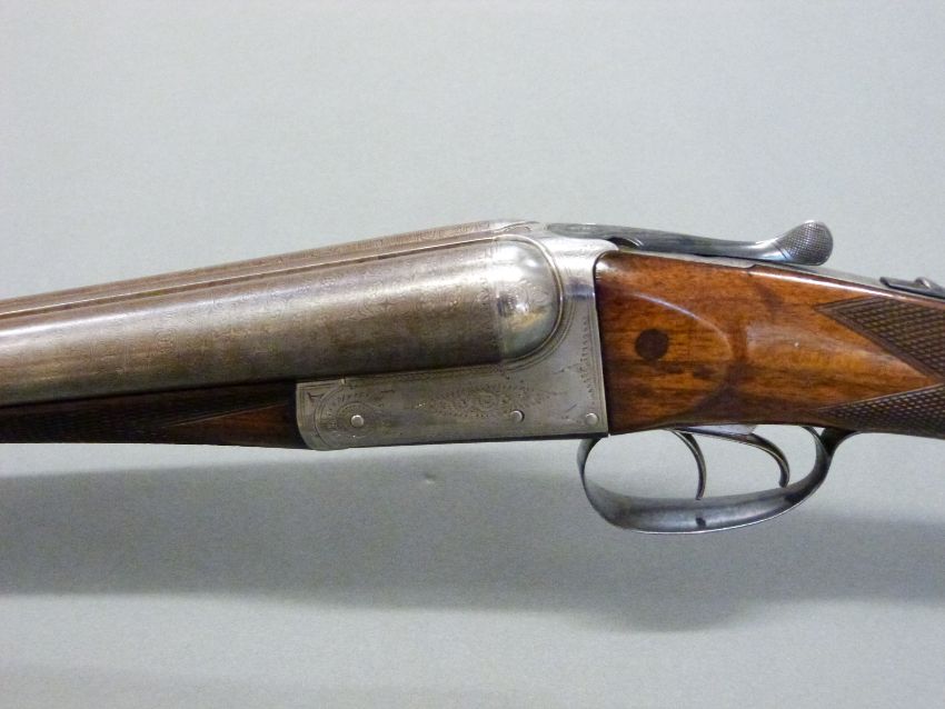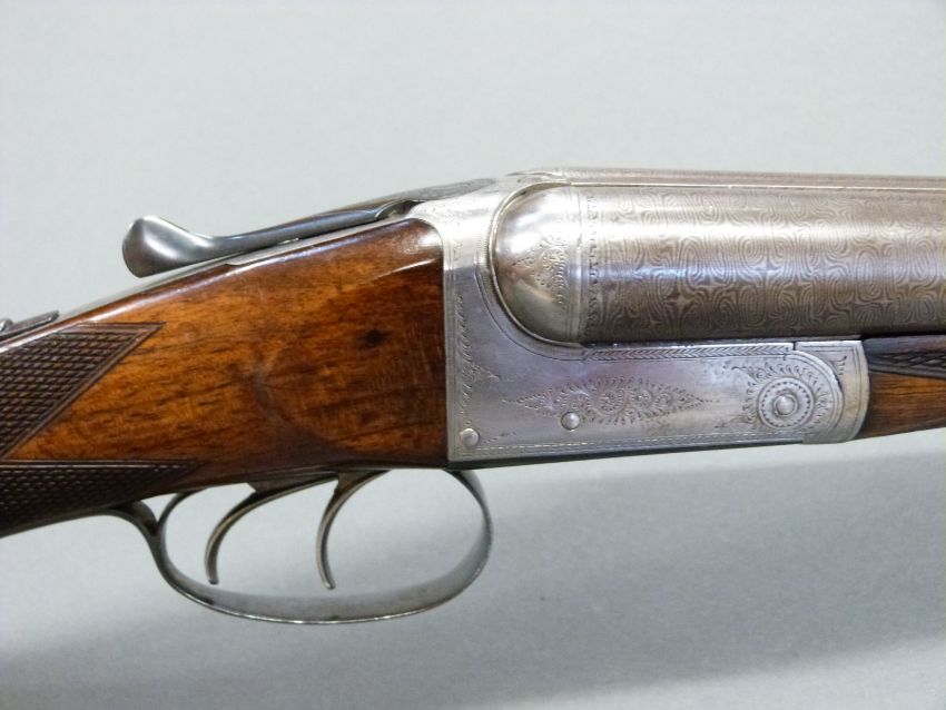 Robert Hughes & Sons 12 bore side by side shotgun with engraved locks, top plate, trigger guard and top lever, chequered grip, double trigger, vacant cartouche to stock, two part steel butt plate, horn tipped forend and 30 inch Damascus barrels engraved 'R.Hughes & Sons Makers London & Birmingham', overall length 118cm, serial number 26519. PLEASE NOTE THAT A VALID RELEVANT FIREARMS/SHOTGUN CERTIFICATE IS REQUIRED TO HANDLE/PURCHASE THIS ITEM.