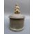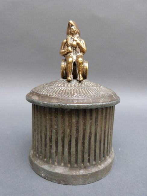 An 18th / 19thC cast figural tobacco jar topped with brass figure seated on a barrel, 15cm tall