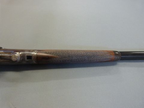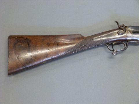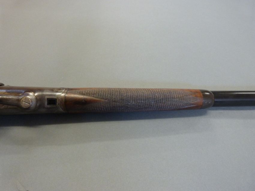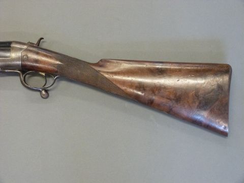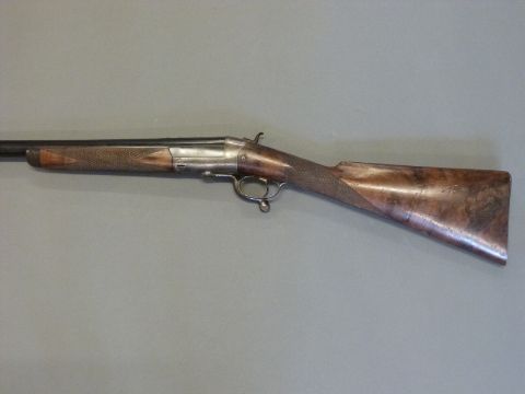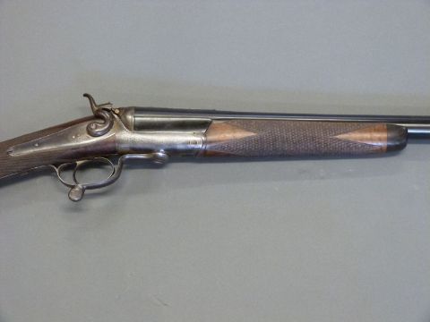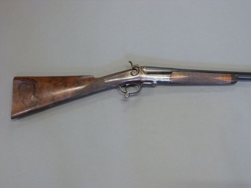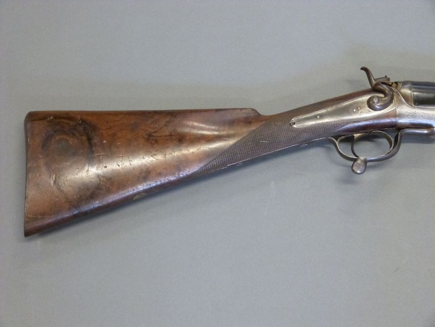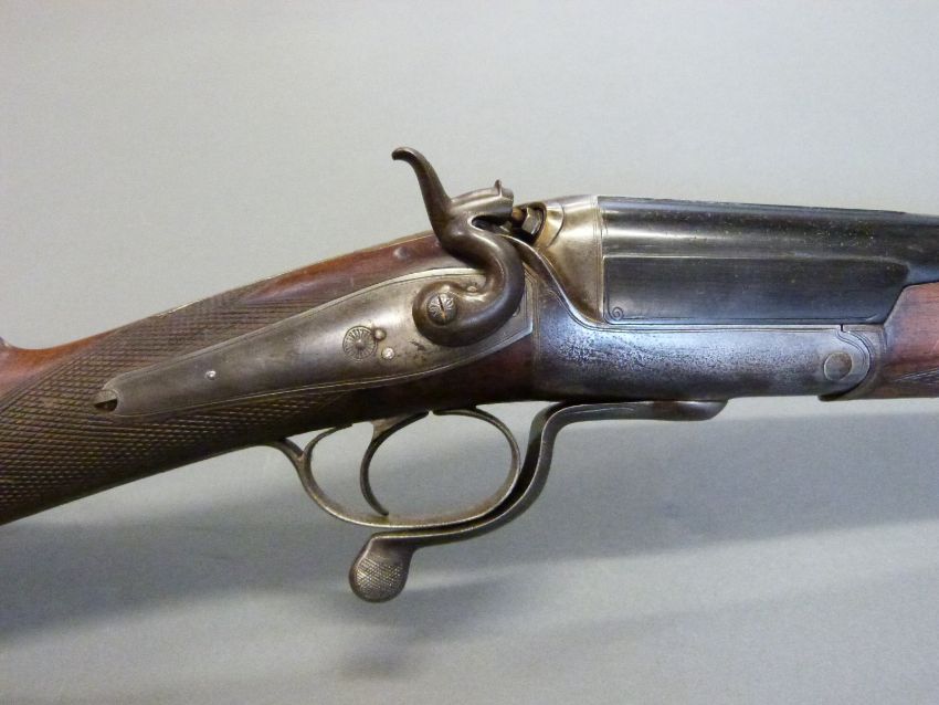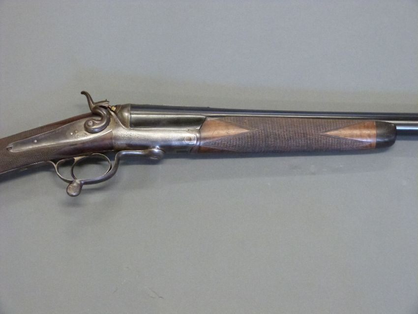 E M Reilly & Co of London 8 bore single barrelled hammer action shotgun with rotary underlever, named and line engraved lock, chequered walnut grip and horn tipped forend, vacant brass cartouche to underside of the shaped stock and 36 inch barrel, overall length 135cm, NVSN.