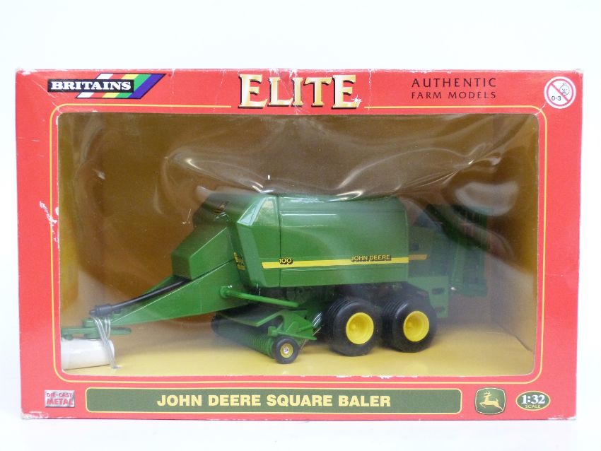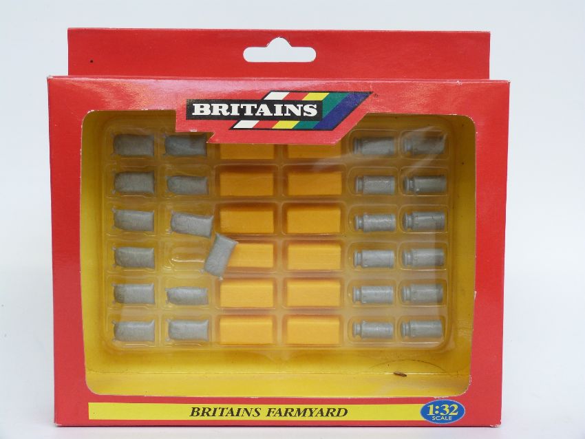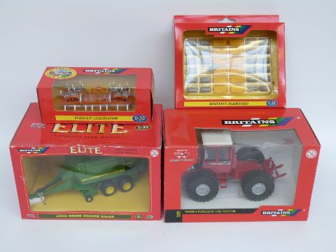 Four Britains 1:32 scale diecast model farm vehicles and accessory sets, Massey Ferguson 1505 Tractor 42105, John Deere Square Baler 40532, Fold Up Cultivator 9550 and bales, milk churns and sacks 40949, all in original boxes