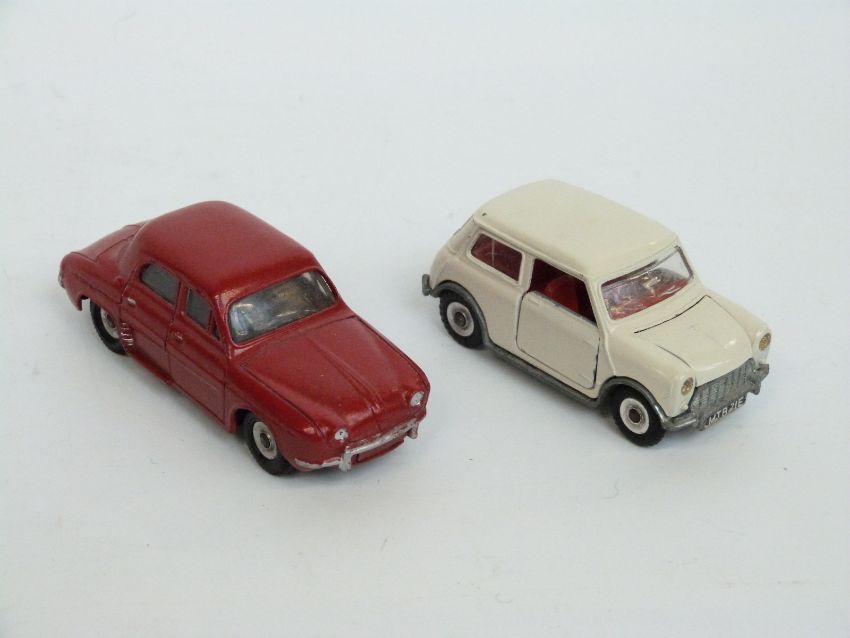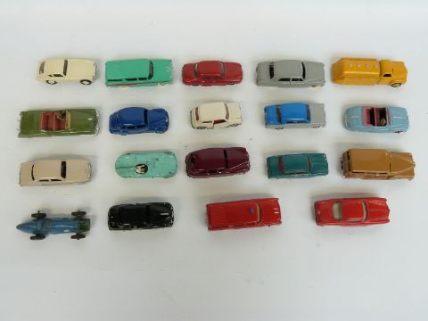 Nineteen Dinky Toys diecast model vehicles including racing cars, fire car, tanker, Mini Cooper etc