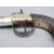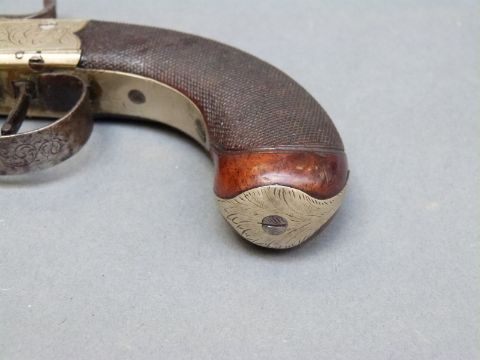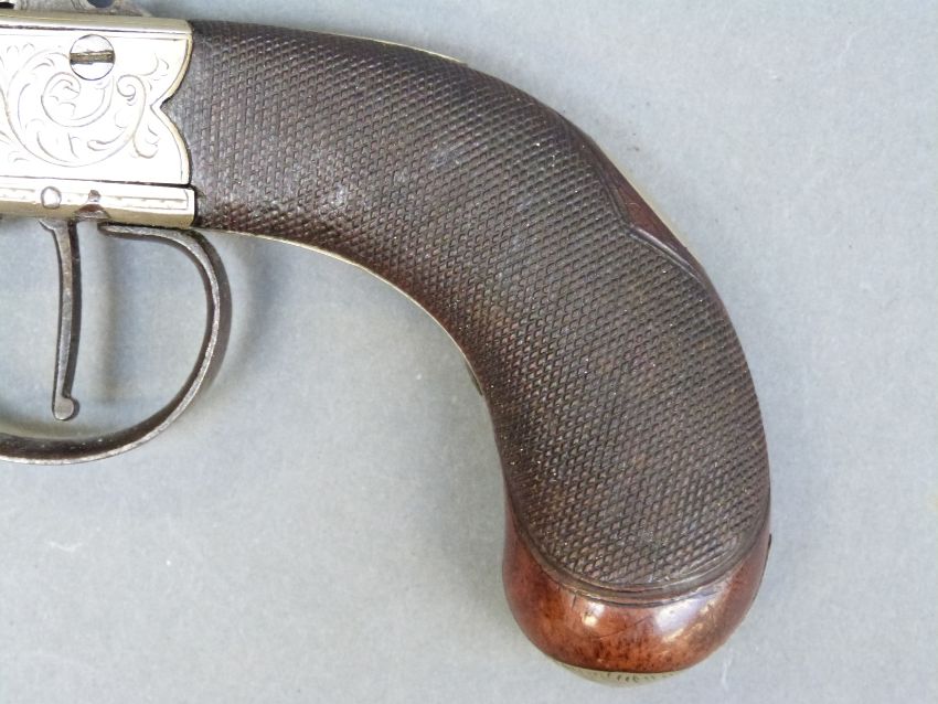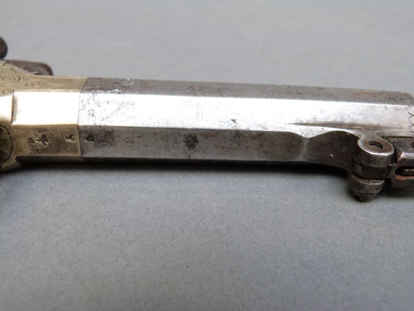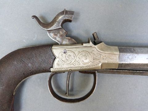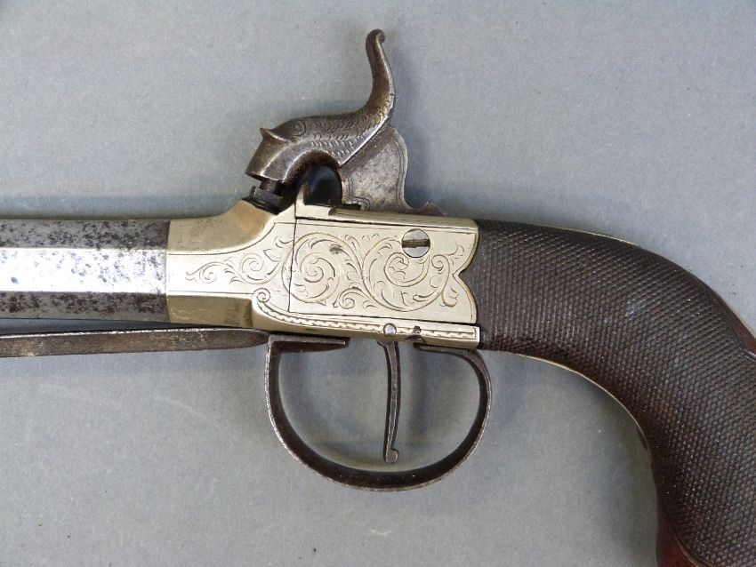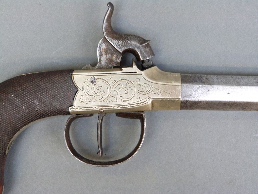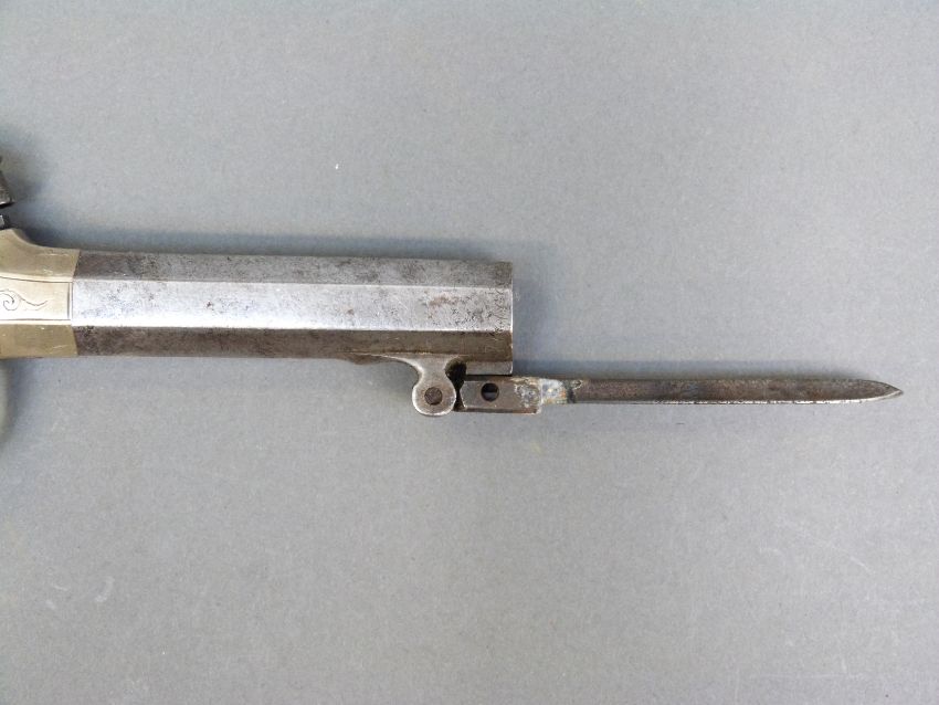 Percussion hammer action pistol with sprung bayonet, engraved lock, stylised dolphin hammer, top plate named 'Moore Drogheda', engraved trigger guard and butt plate, chequered grip, vacant wrist cartouche and 3 inch octagonal turn off smooth bored barrel, overall length 20cm.