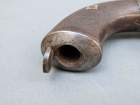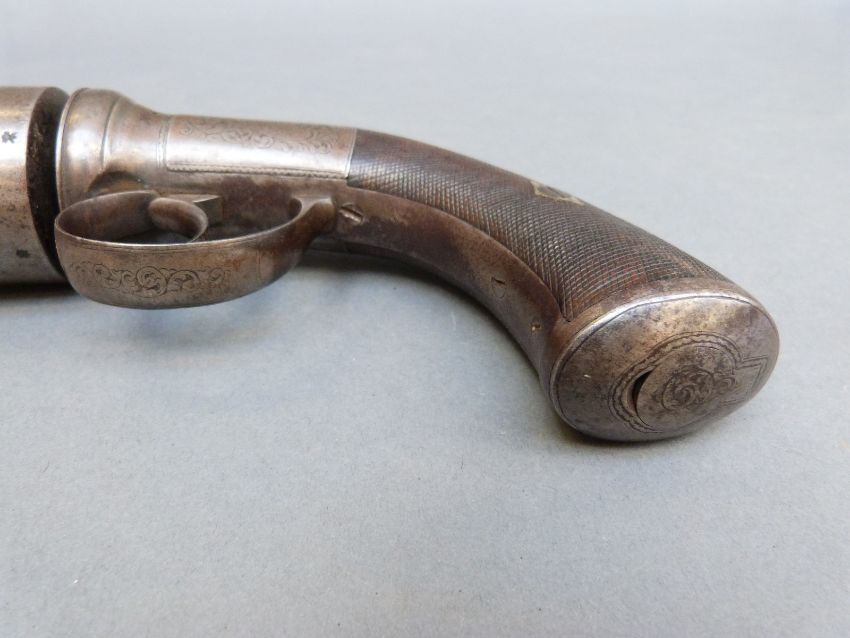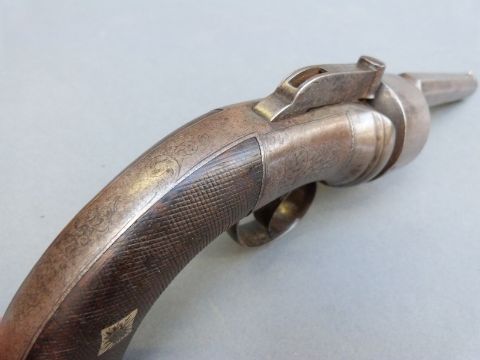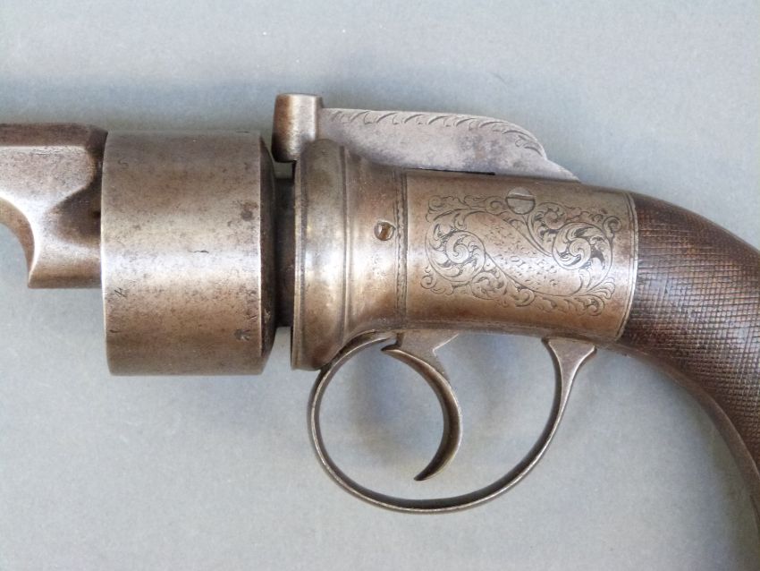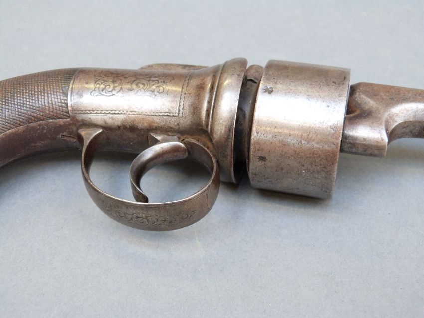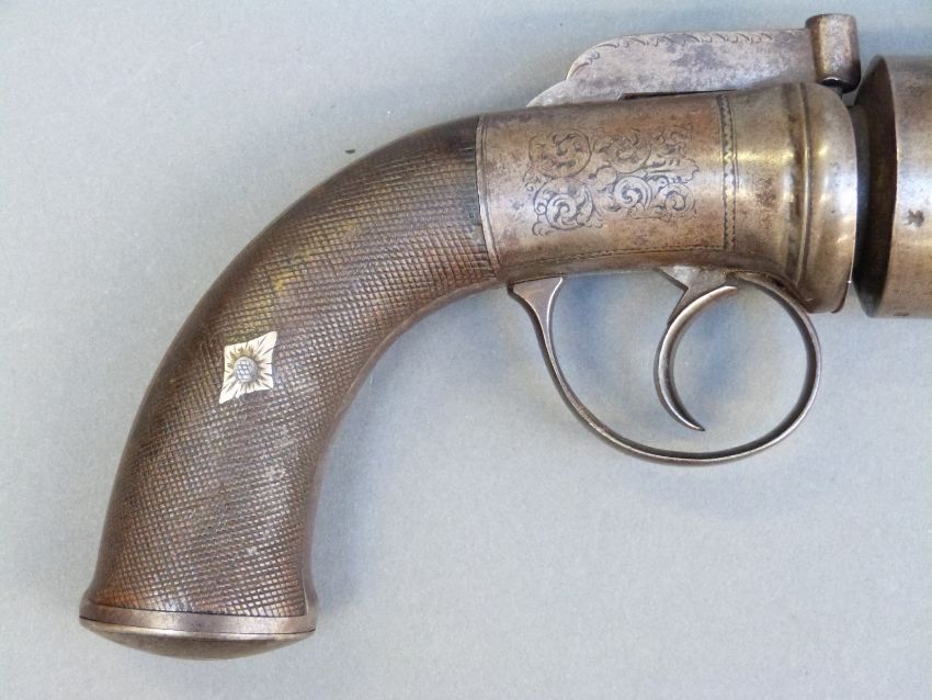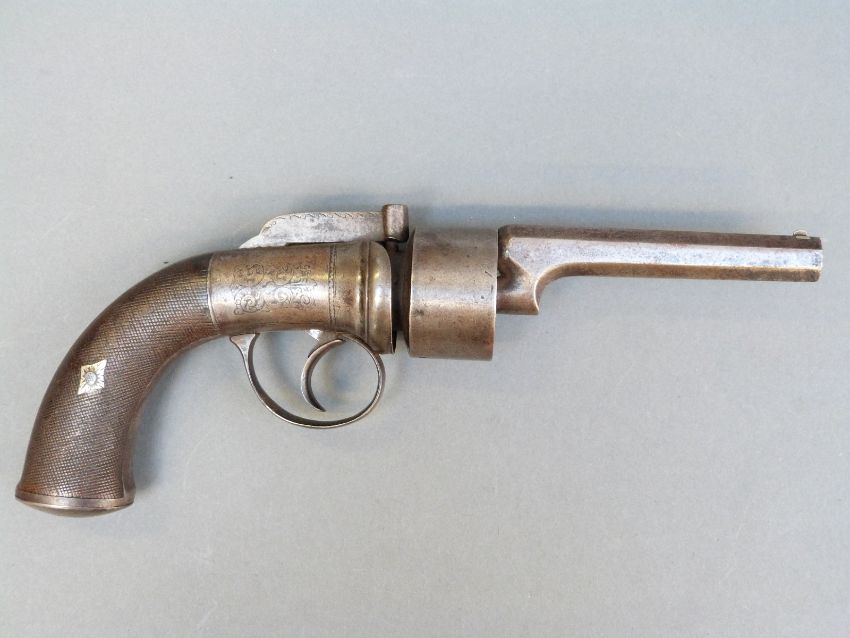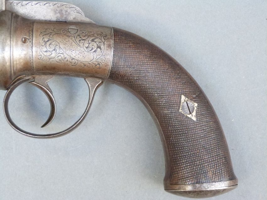 Johns of Falmouth six-shot percussion bar hammer action transitional revolver with engraved locks and trigger guard, chequered grip, storage compartment to butt, proof stamps to chamber and 4.5 inch octagonal rifled barrel engraved 'Johns Falmouth', overall length 29cm.