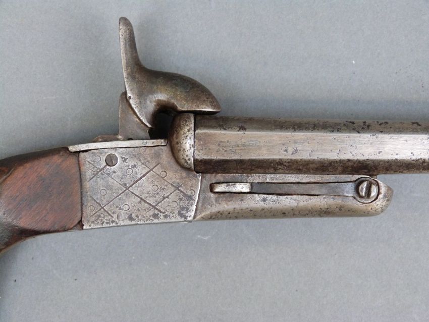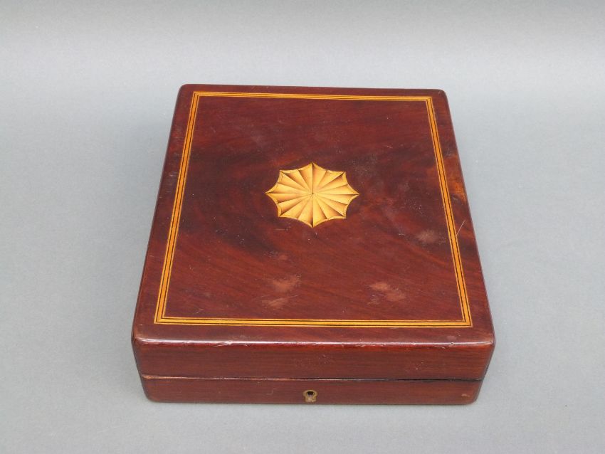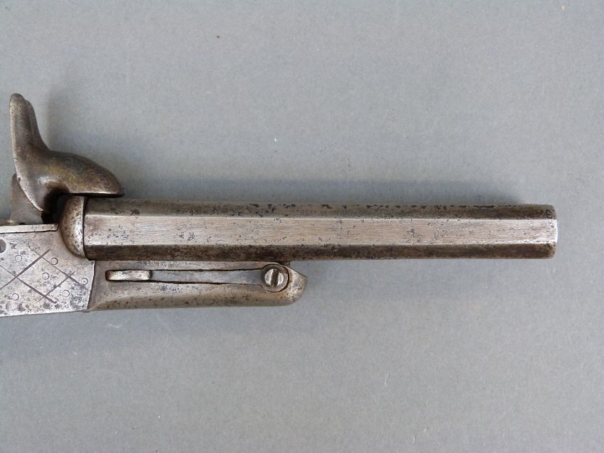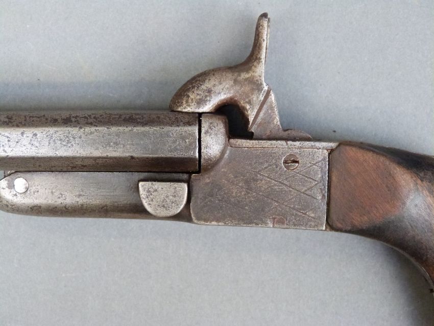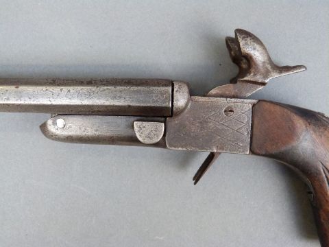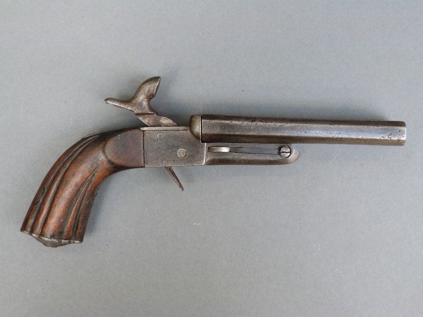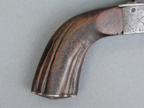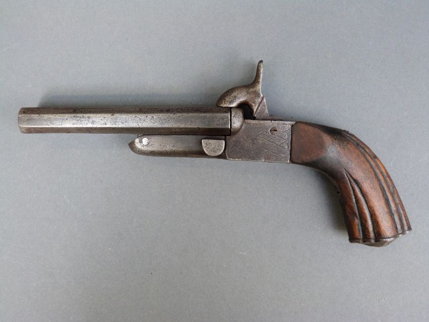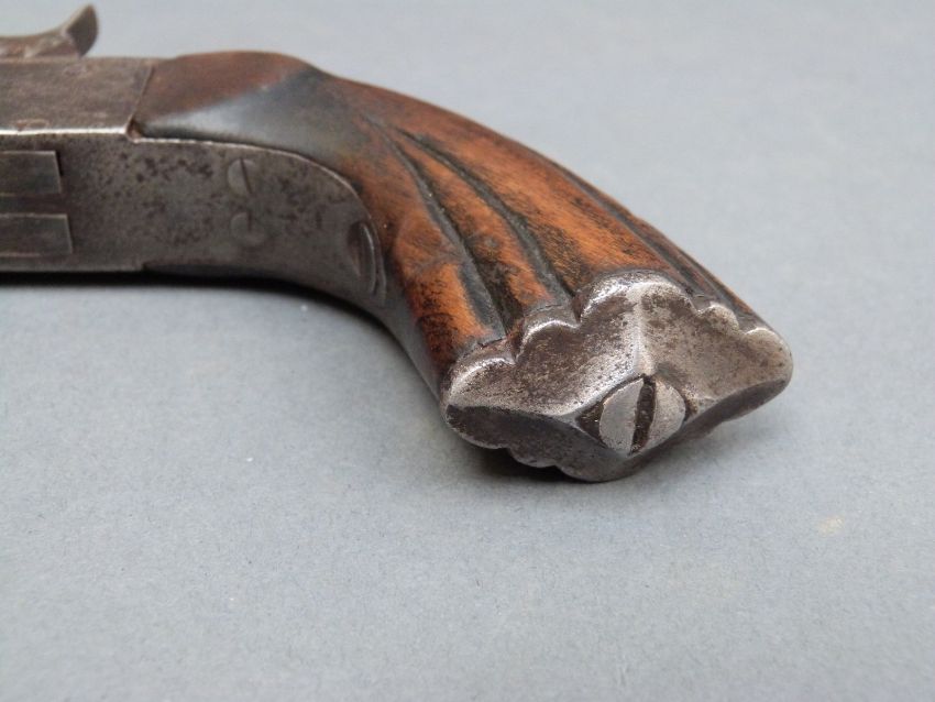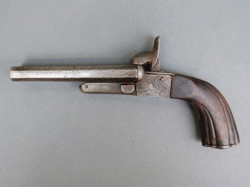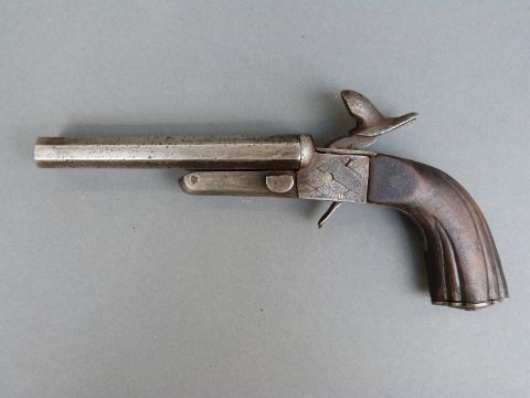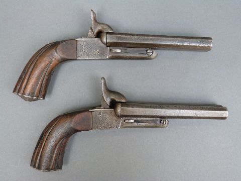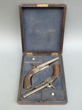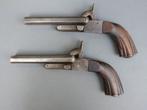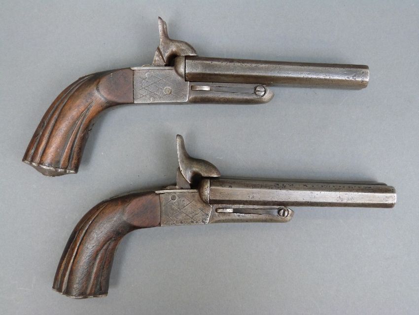 A pair of percussion hammer action side by side pistols with chequered locks, carved reeded grip, shaped butt cap, folding triggers and 4.5 inch octagonal rifled barrels, overall length 23cm in lockable fitted mahogany box with boxwood inlay, lined interior and ivory handled storage compartment