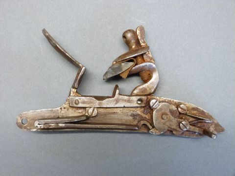 Flintlock hammer action lock stamped Tower and with crown over GR cipher, possibly from a Brown Bess, 18cm long