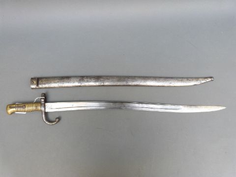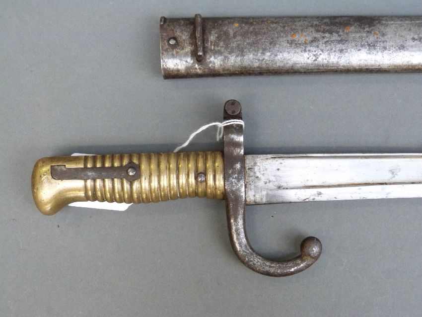 M1866 French Chassepot Yataghan bayonet in sheath, dated to edge of blade 1866 and marked U70737 to guard