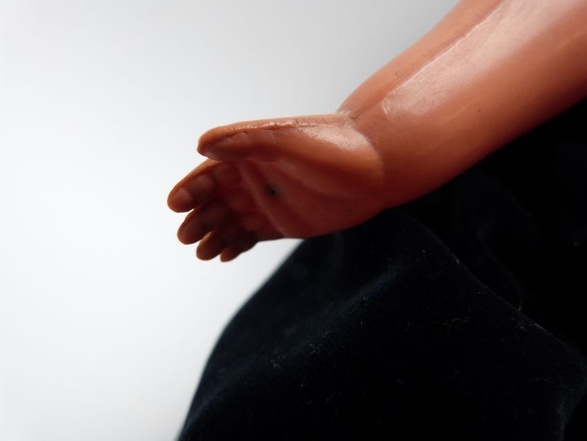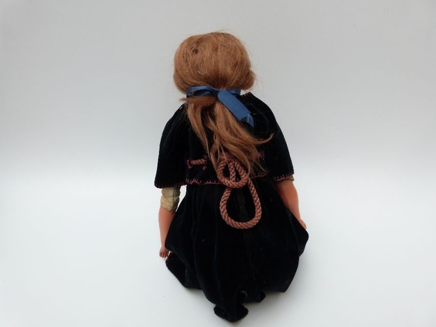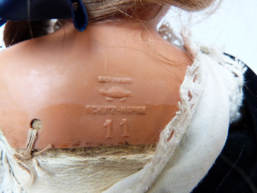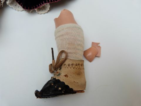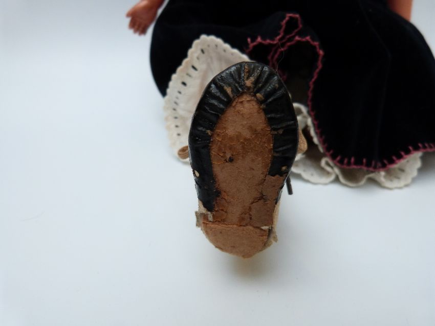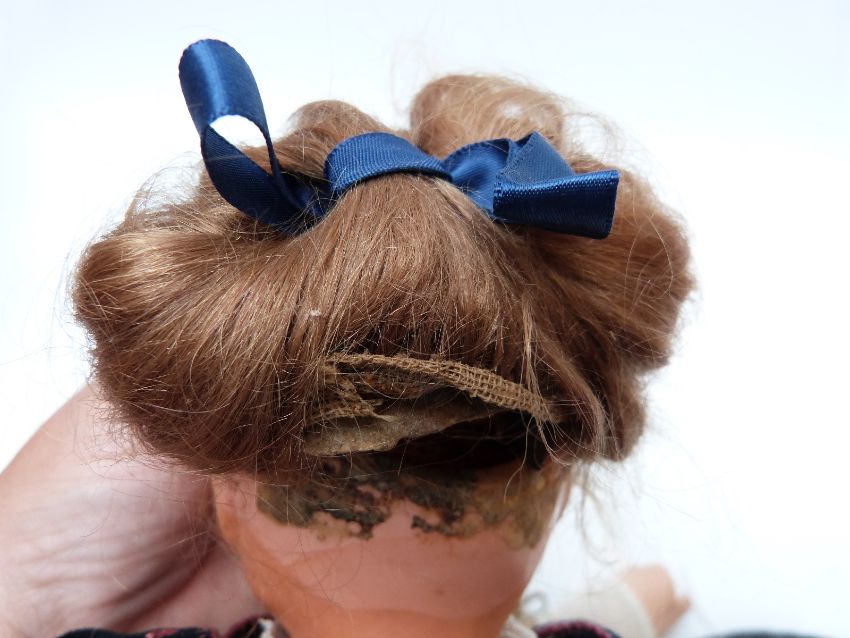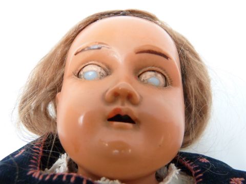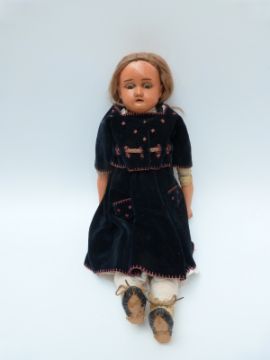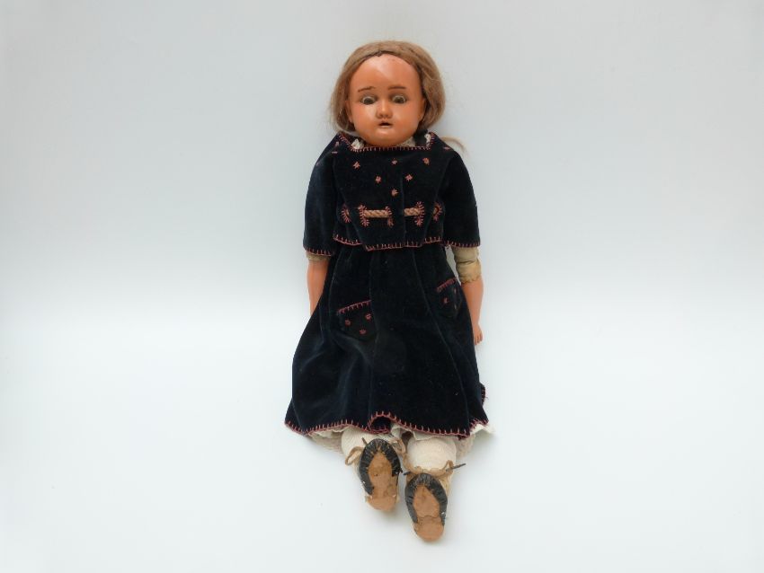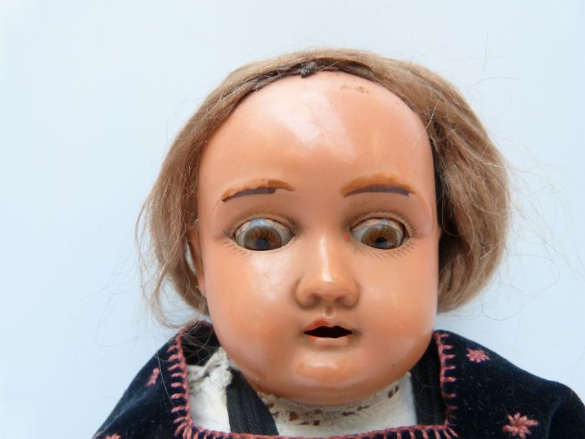 German doll with open mouth, weighted brown eyes, brown hair and kid leather jointed body, dressed in period clothing, 44cm tall
