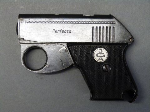 Perfecta JGA .22 short semi automatic top venting blank firing pistol with chequered grips and rope twist decoration, NVSN