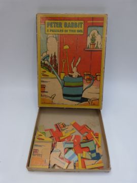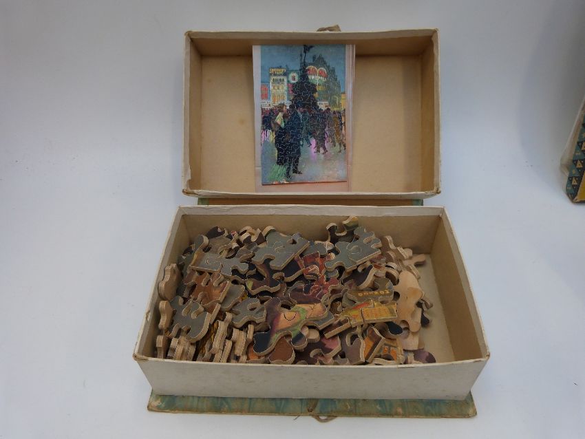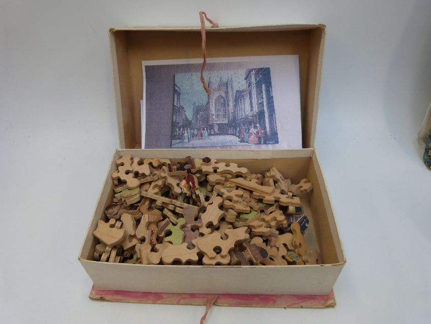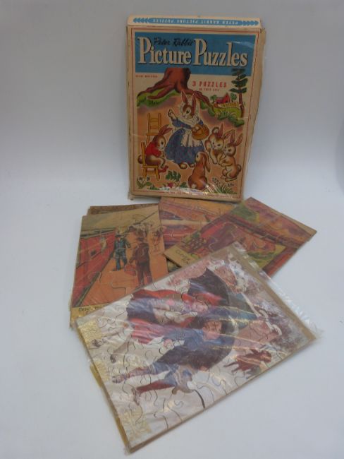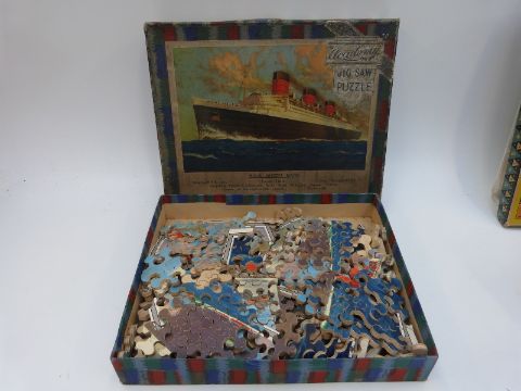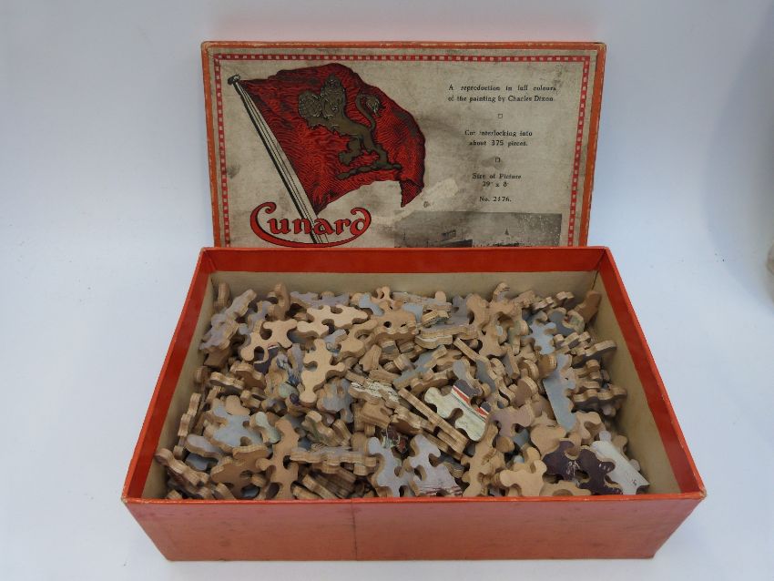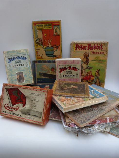 Over 25 19thC and later jigsaw puzzles including Chad Valley GWR, Beau Nash's Bath, Piccadilly Circus and King Arthur on Dartmoor, Academy RMS Queen Mary, Cunard White Star Line, RMS Mauretania leaving New York, Peter Rabbit etc, some in original boxes