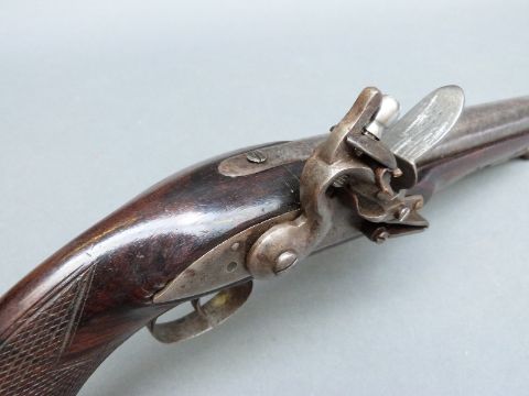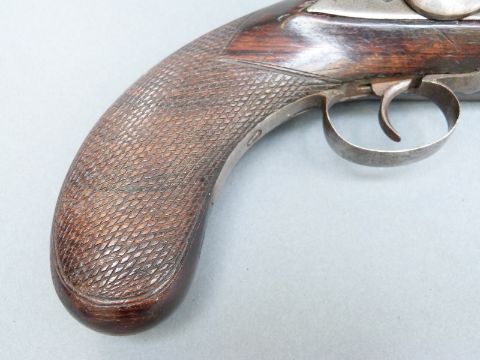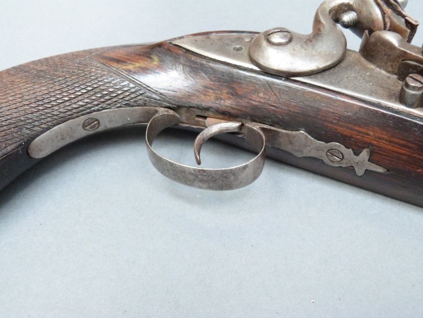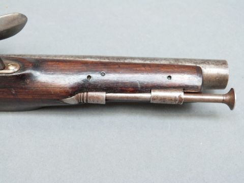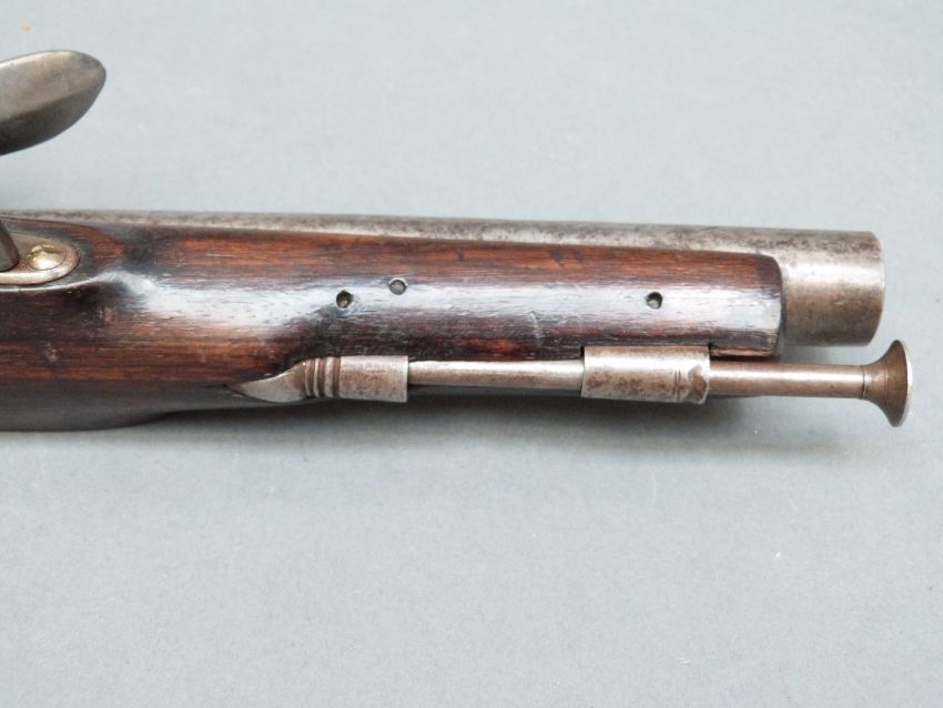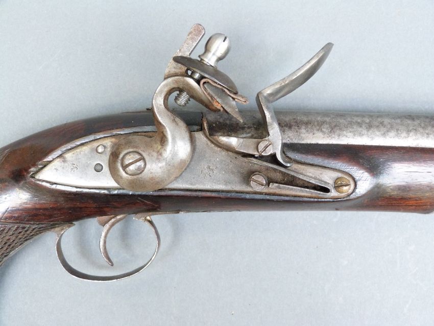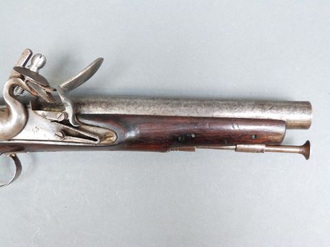 16 bore flintlock hammer action service pistol with proof stamped lock, chequered grip, stock and top plate stamped 382, steel ram-rod and 8.25 inch steel smooth bored barrel, overall length 37cm