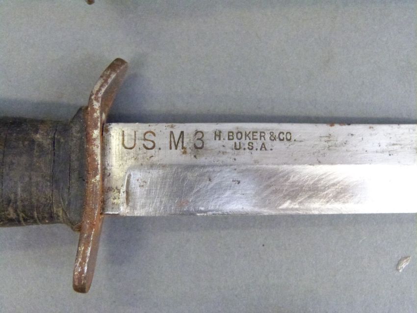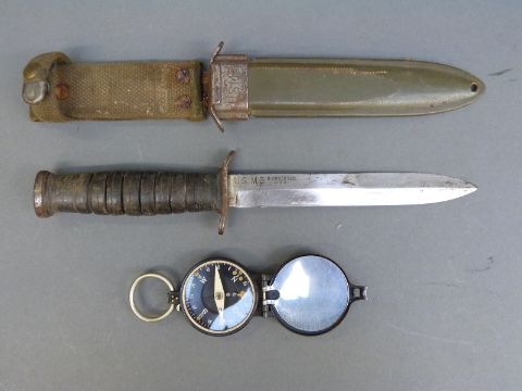 US M3 sheath knife, the blade impressed H Baker & Co USA, in scabbard, together with a military compass marked Busch 30448 DRGM 1934