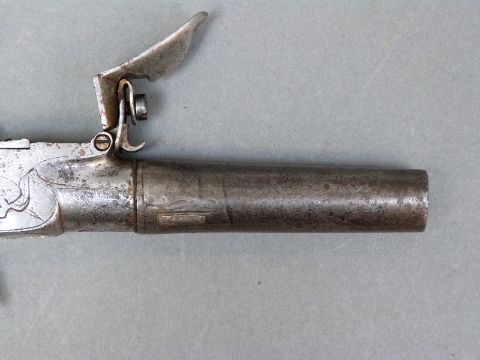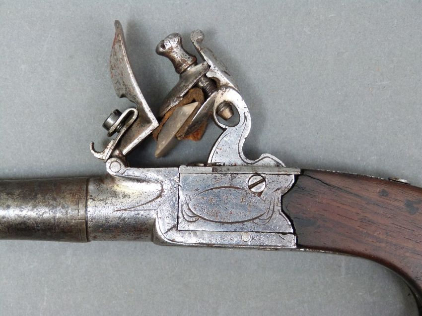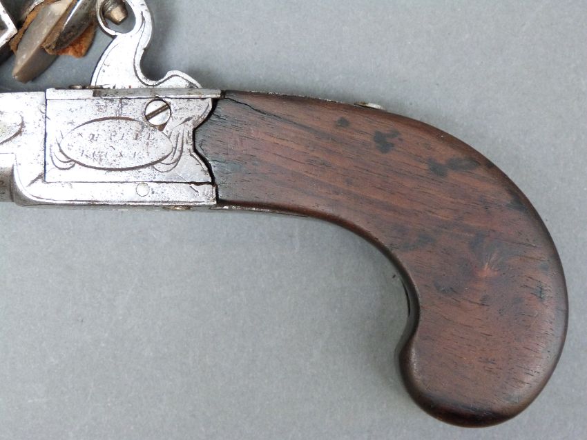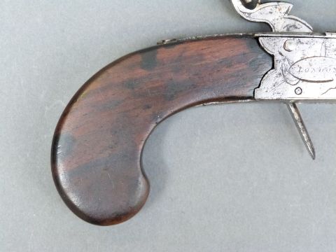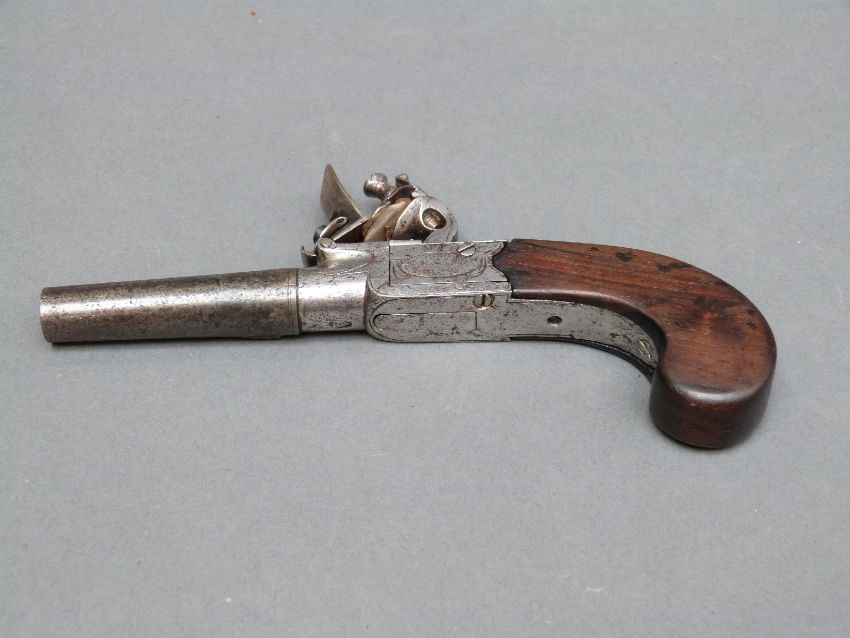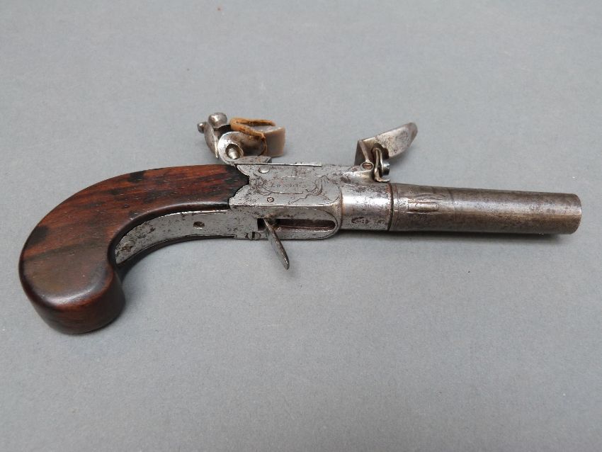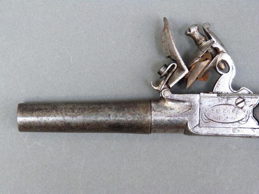 An indistinctly named English flintlock hammer action pistol with lock engraved London, folding trigger and 2.5 inch turn off smooth bored barrel, overall length 19cm.