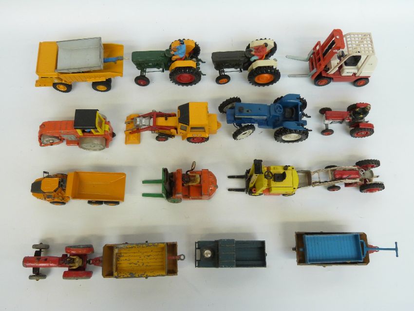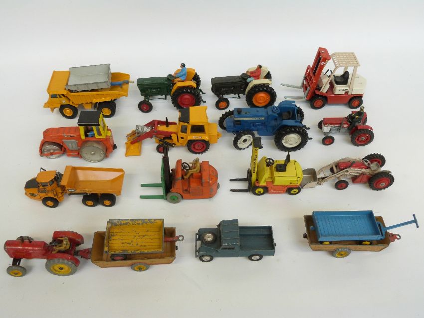 Eighteen Corgi, Dinky, Britains and Joal diecast model agricultural and construction vehicles