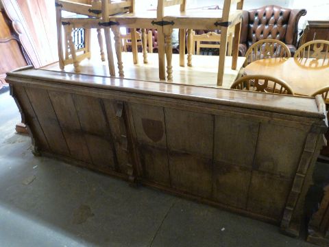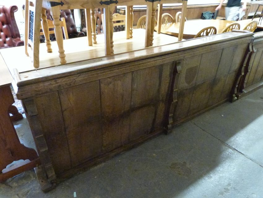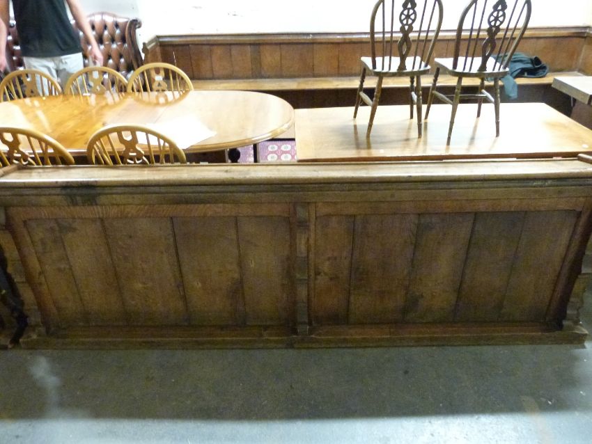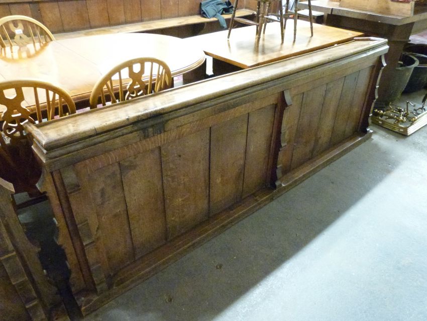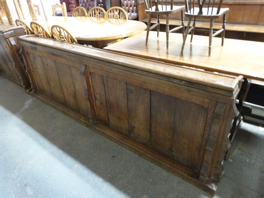 Two 19thC oak pew fronts / lecterns, length 235cm, and a pine prayer lectern, ex St Bartholomew's Church, Cam