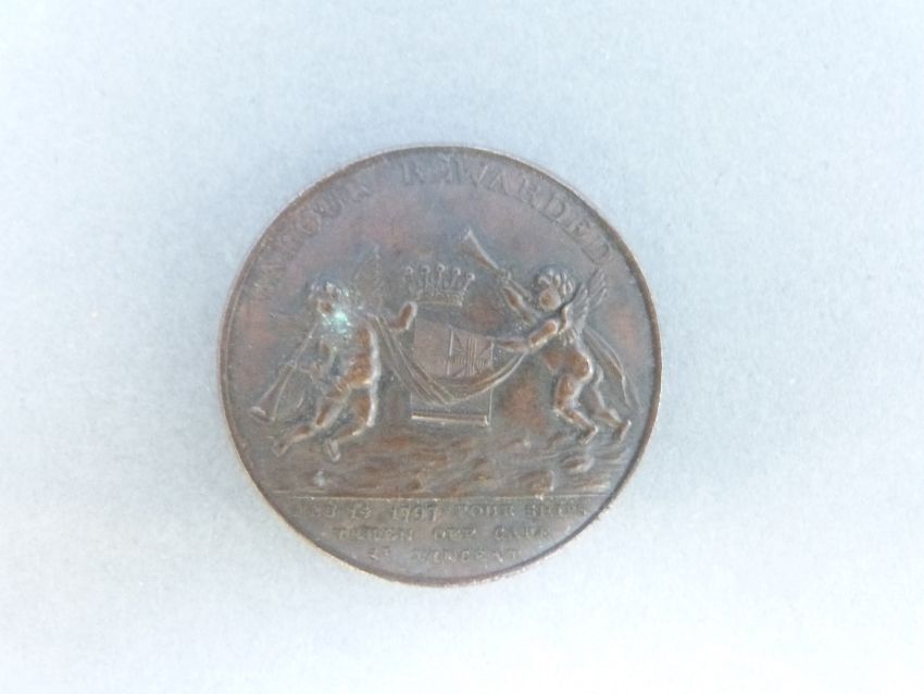 Earl St Vincent bronze medal coin commemorating John Jenuis 1735-1823 and the Battle of St Vincent 1797 'Valour Rewarded' Feb 14th four ships taken off Cape St Vincent to reverse