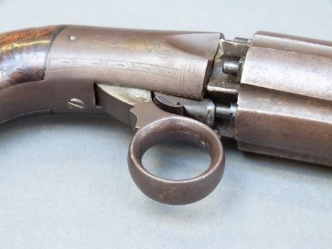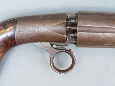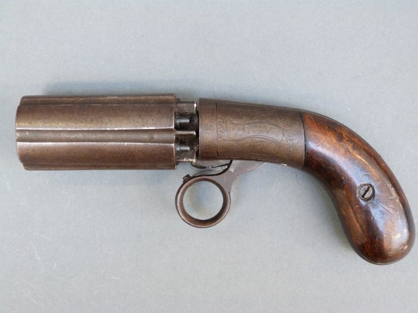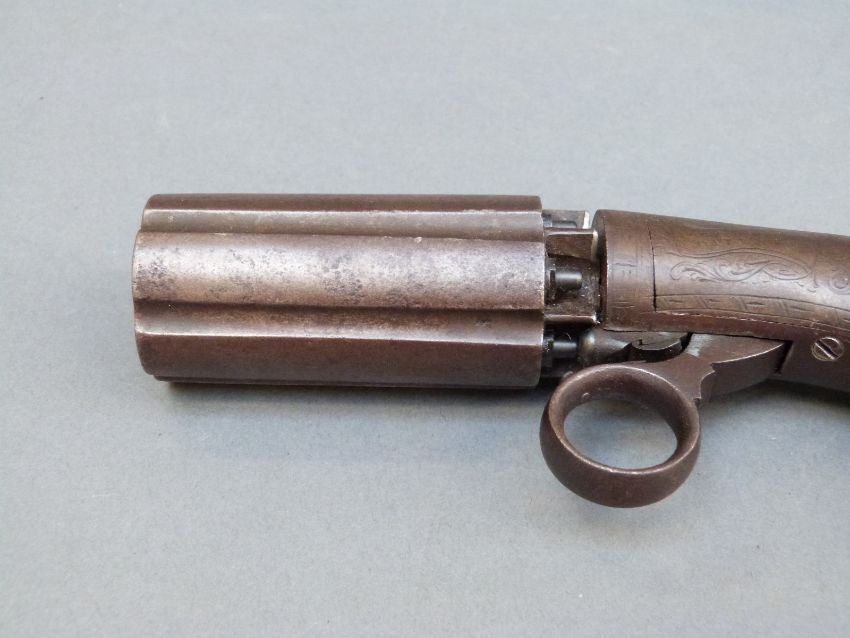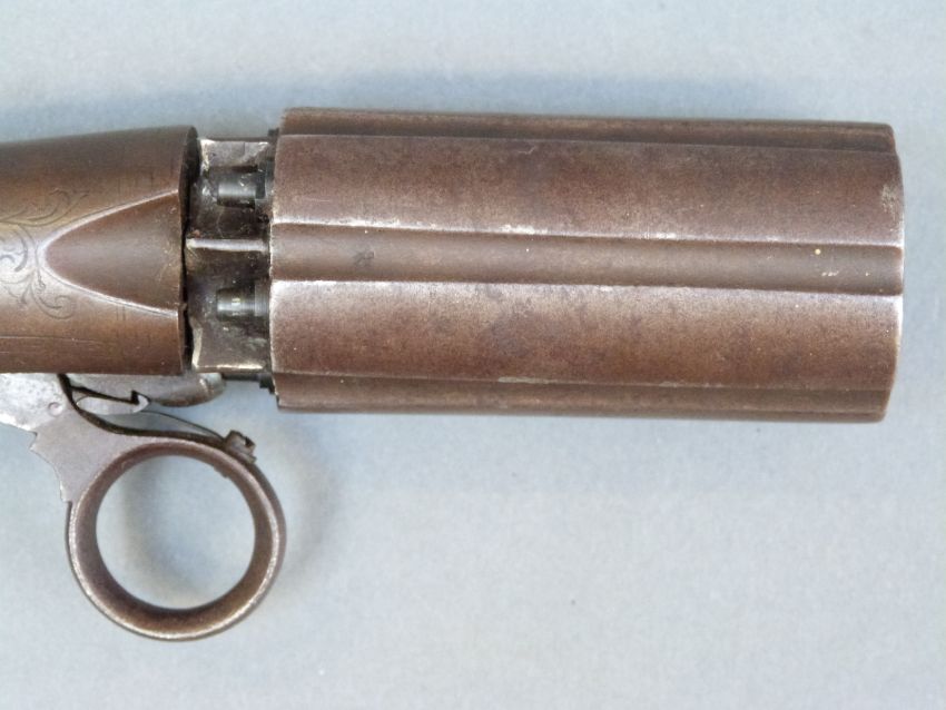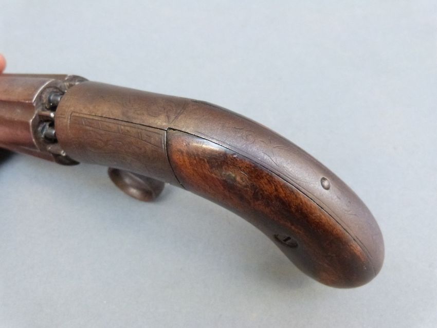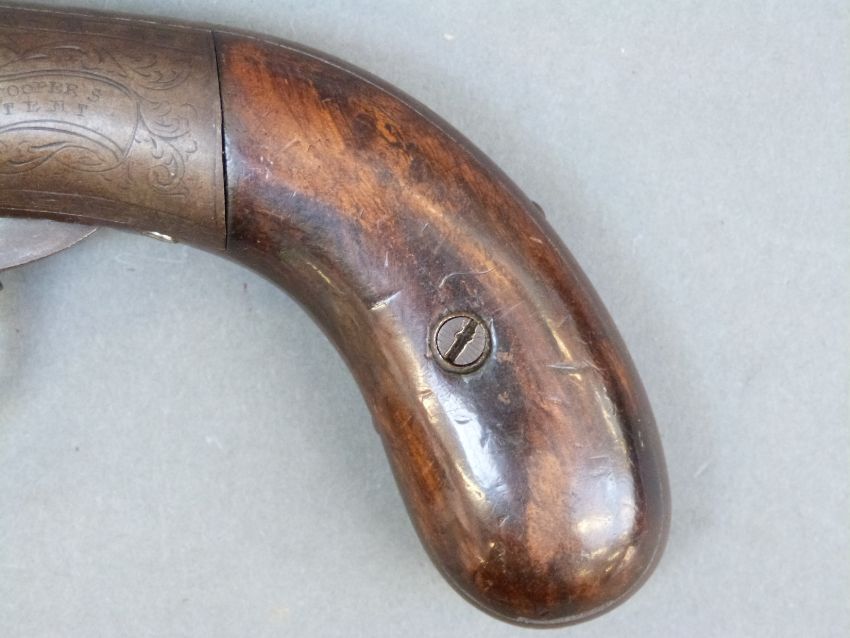 J R Cooper's patent 72 bore percussion pepperbox revolver with named and engraved lock, ring trigger and 3 inch smooth bored barrels, overall length 21cm.