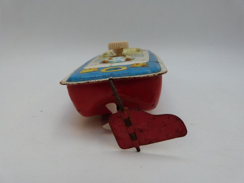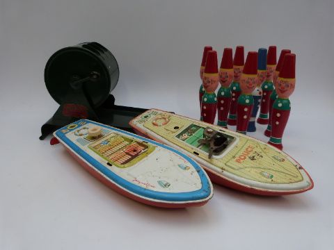 A quantity of vintage toys including two clockwork boats, a vintage Rolette machine and a quantity of vintage painted skittles with ball