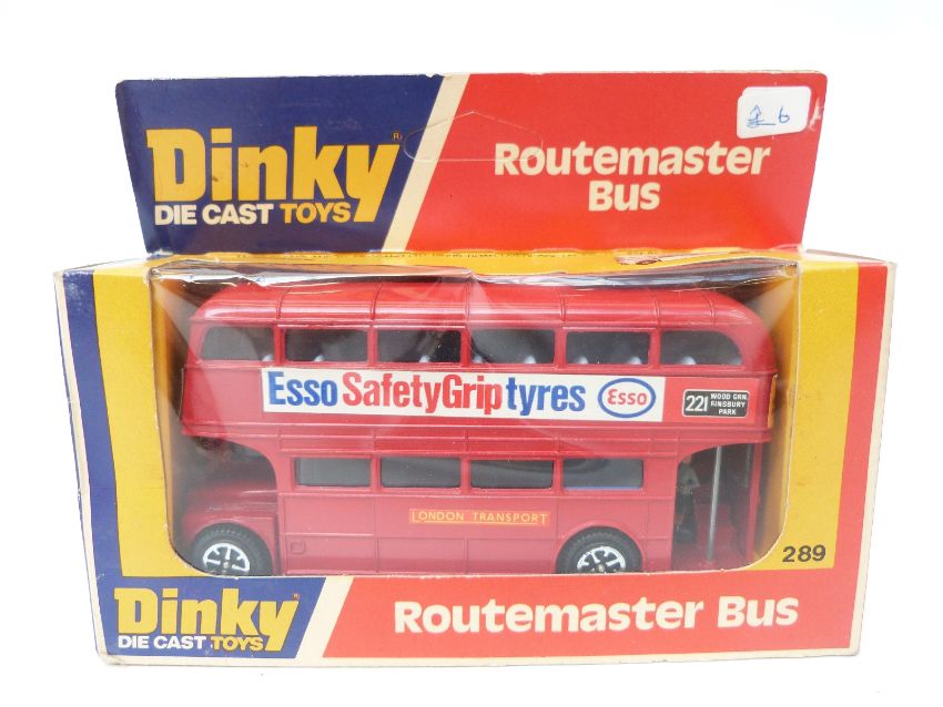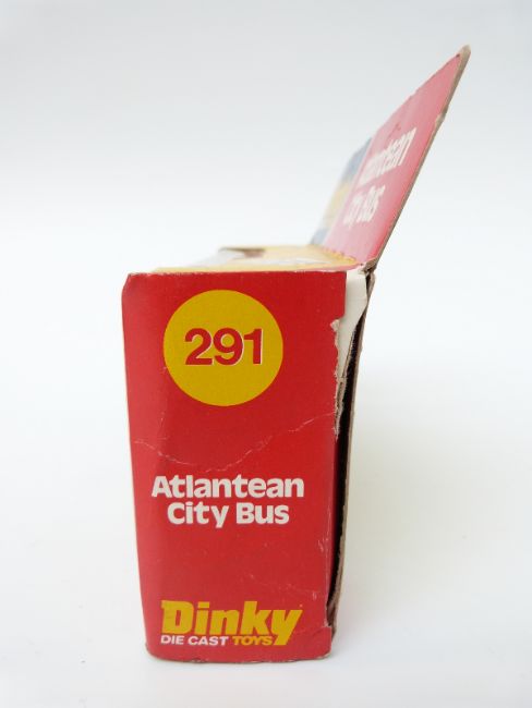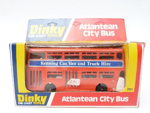 Three Dinky Toys diecast model buses Routemaster Bus 289, Atlantean City Bus 291 and Leyland Atlantean Bus 292, all in original boxes.