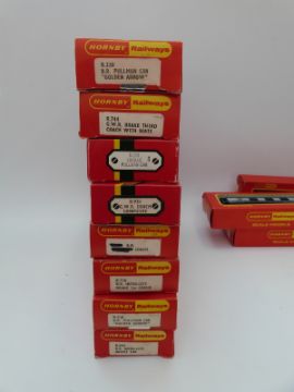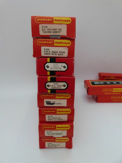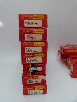 Twenty-one Hornby 00 gauge carriages including a Royal Mail Operating Mail coach set, all in original boxes