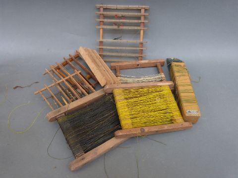 A collection of vintage fishing line winders/dryers including three by Milward, another with ferrules for a reel attachment in the style of Hardy, further examples with line casts and flies
