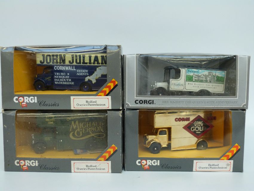 Six Corgi diecast model commercial vehicles and vehicle sets Gratton 97084, Freeborn's 97086, three Bedford O Series Pantechnicon 97080, Q953/8 and one other and Balmoral Thornycroft Van 97155, some limited edition, all in original boxes